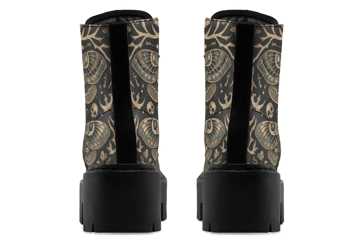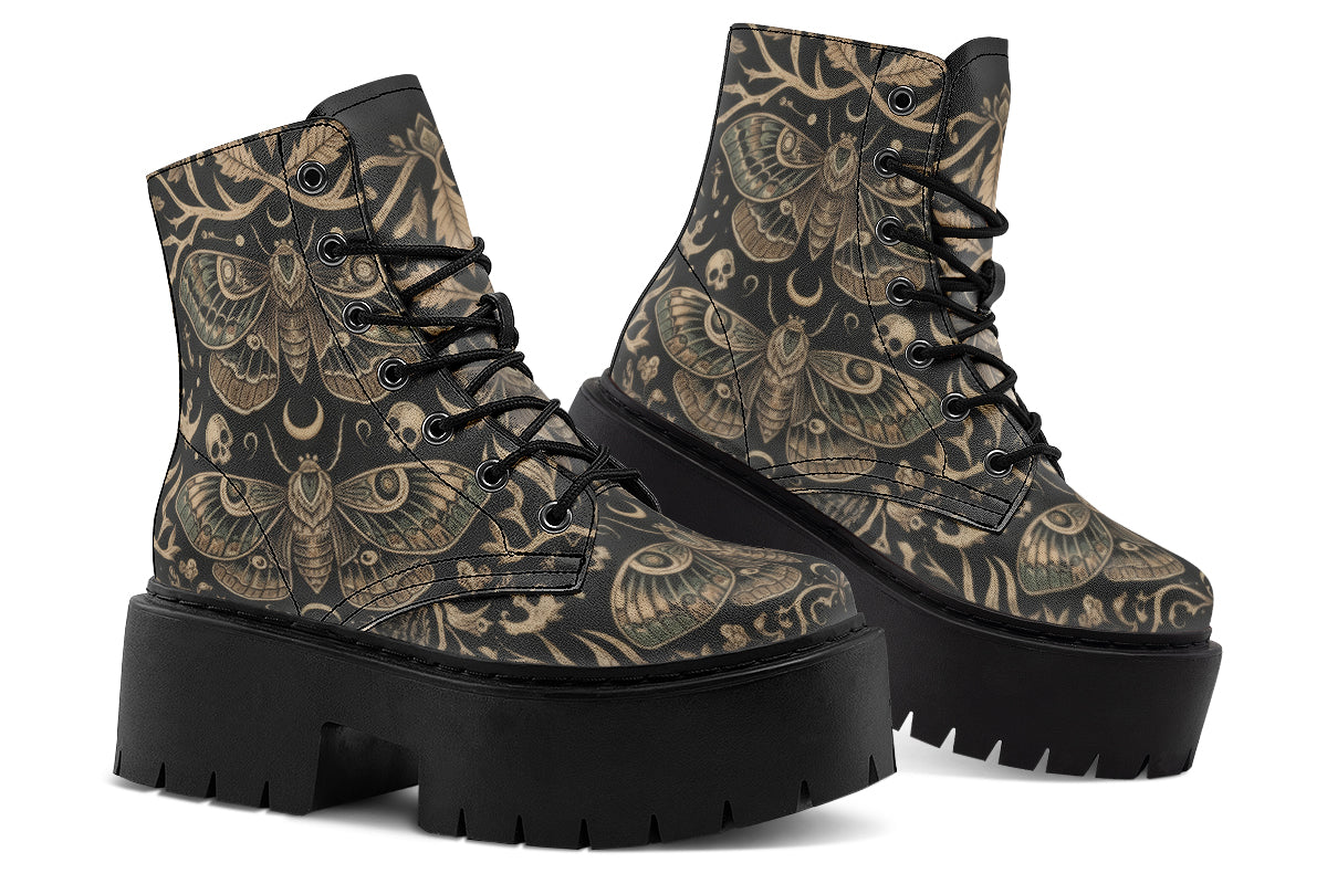 Step out in style as ornate moths, crescent moons, and tiny skulls swirl across your boots like an illustrated spellbook torn from a haunted herbarium. You heard it—death, rebirth, and some killer botany, all on your feet.