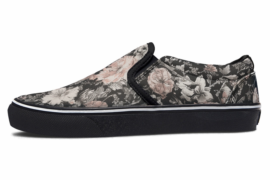 Transport yourself to an enchanted garden where vintage romance blooms with every step. These slipons adorn your feet with a tapestry of nostalgic peonies in soft pinks and earthy tones, set against a backdrop as dark as a witch’s midnight brew. Perfect for conjuring smiles and turning heads.