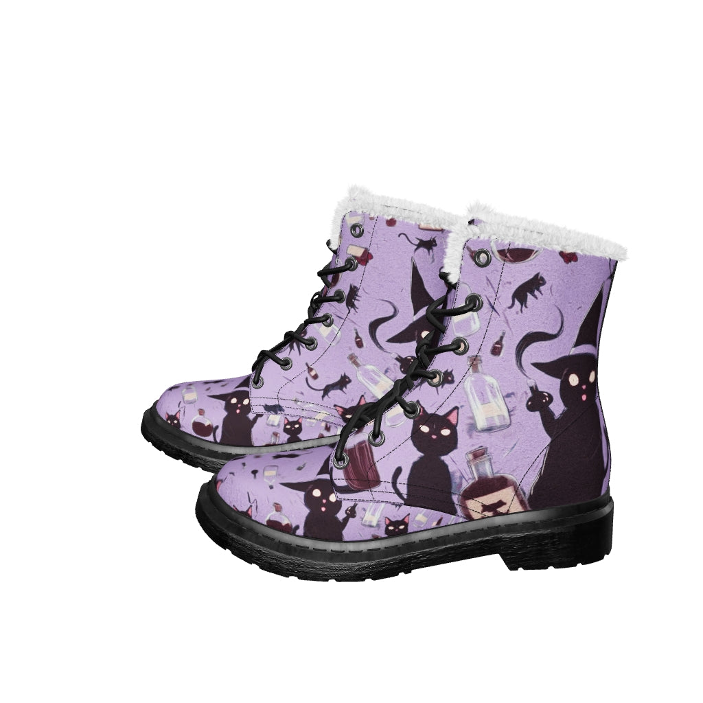 Conjured from pastel gothic dreams, these boots invite chaos—but make it cute. Swarming black witch cats play among glowing potions on lilac, blending whimsical charm with arcane mystique, perfect for those under a feline enchantment.