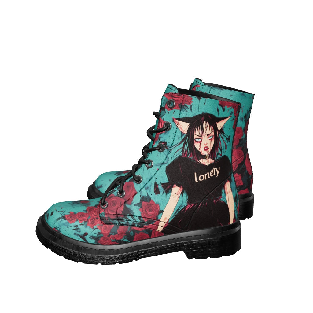 Step softly into the shadows in boots adorned with haunting art: a fox-eared enchantress shedding crimson tears, cloaked in melancholy bearing the emblem “lonely” amidst swirling scarlet roses. Perfect for dark souls navigating life’s rituals—or running late to your own seance.