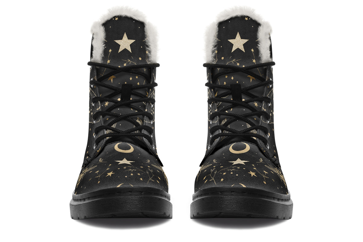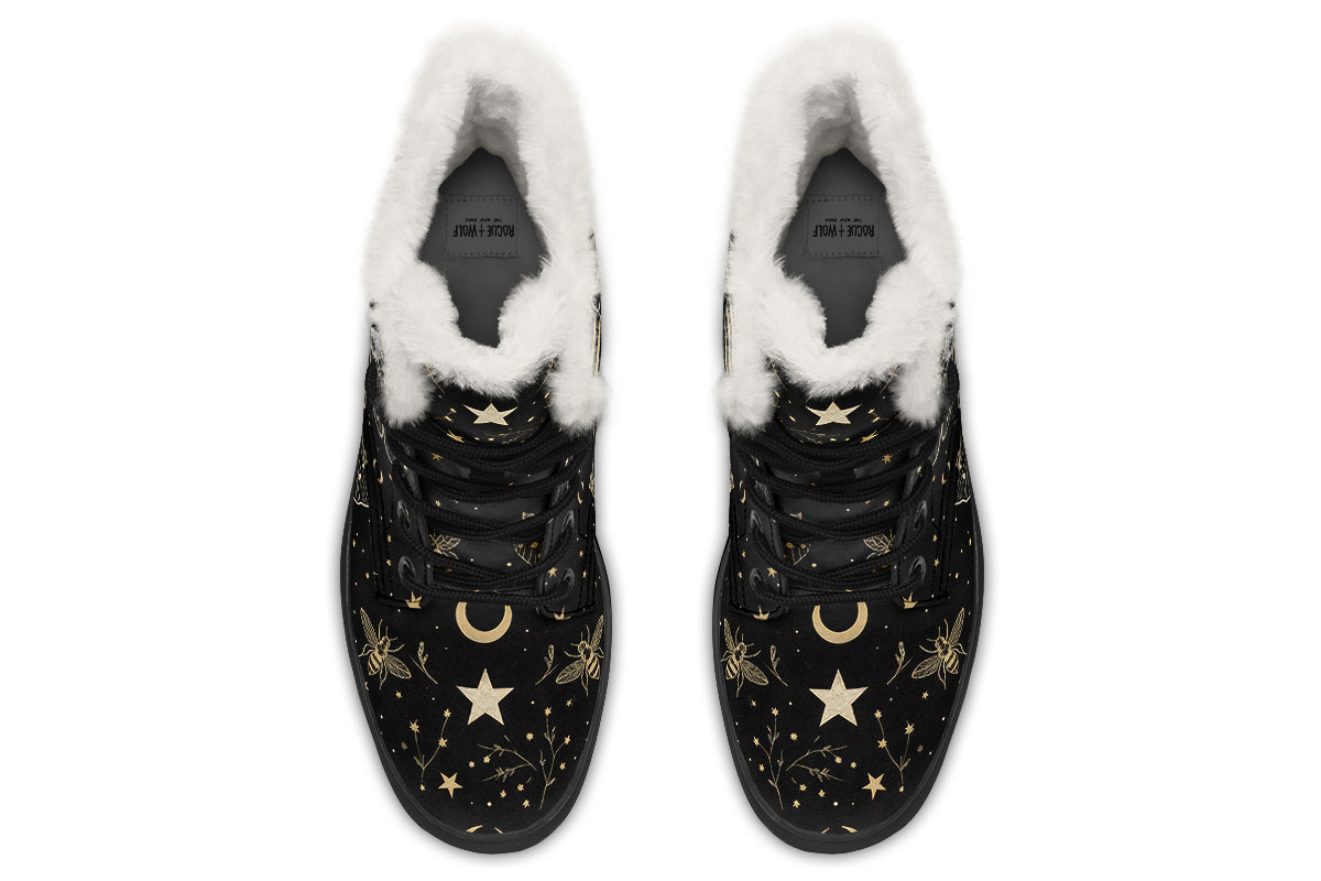 Raise your vibe as golden bees flutter among crescent moons and scattered stars, balancing goth glam with a cosmic wink. These winter boots feel straight out of a witch’s star chart—because what witch wouldn’t want their feet blessed by astral entomology? #NightSkySteppers