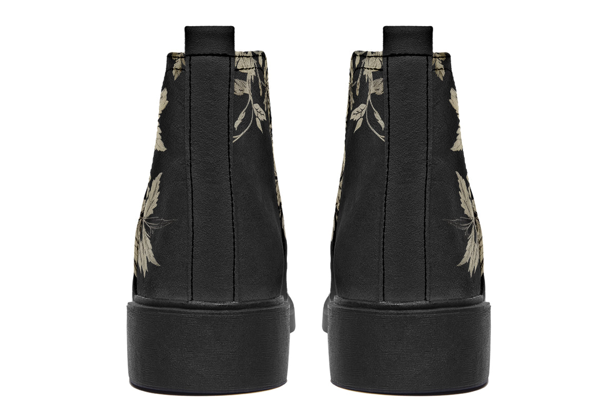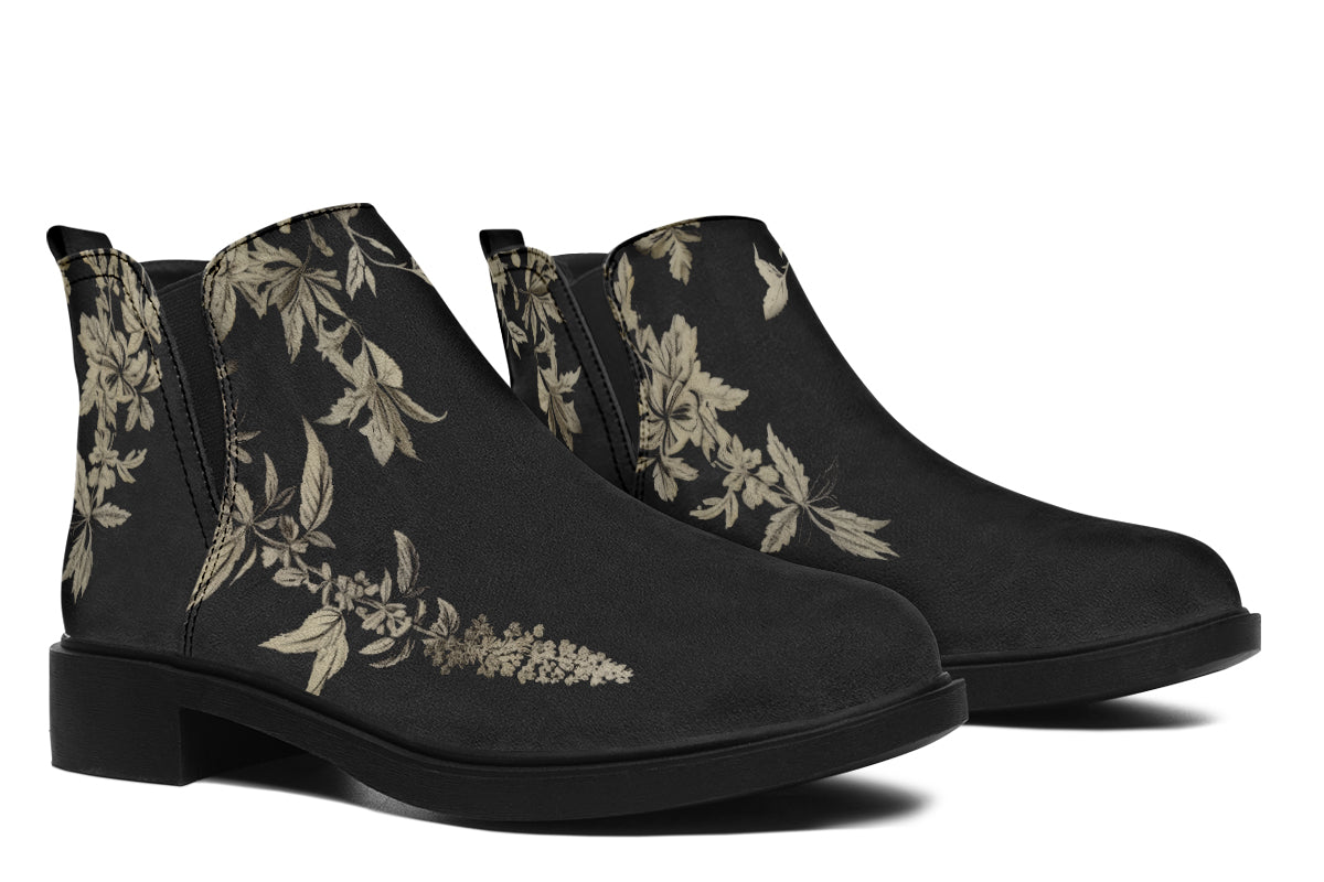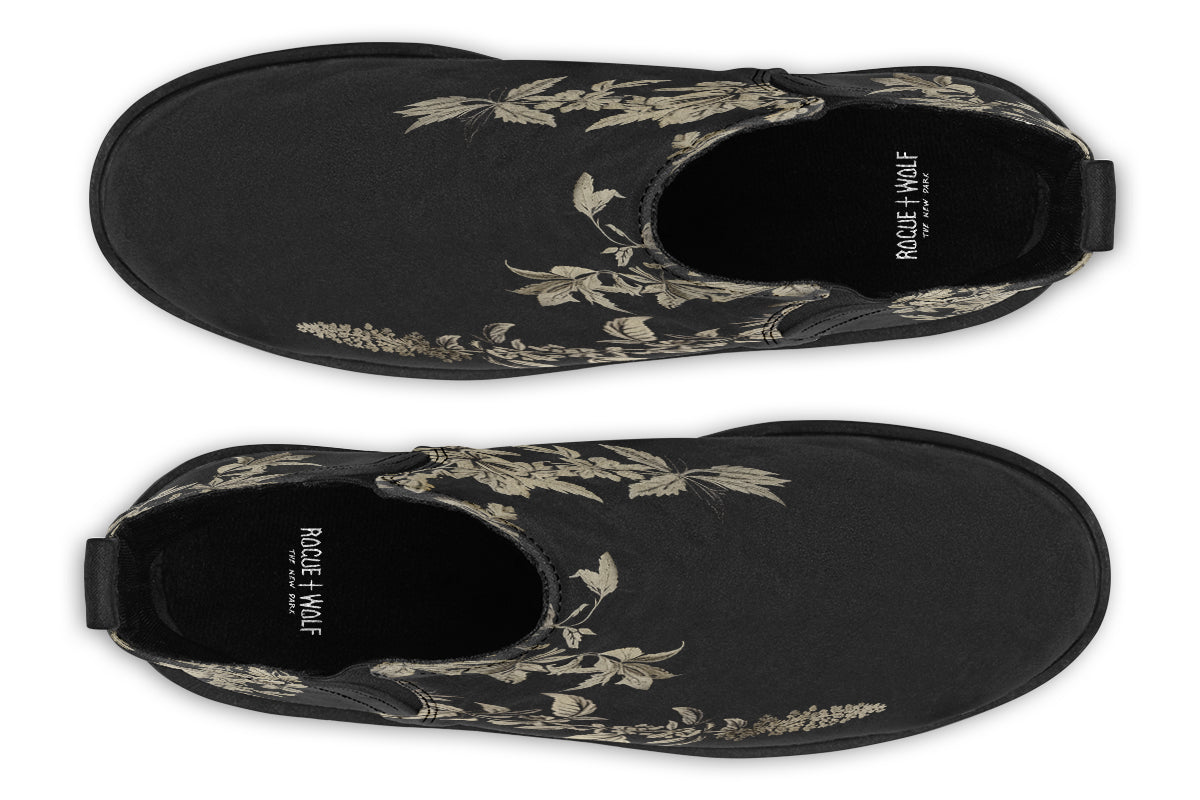 Dark as a raven’s wing, these Chelsea Boots are cloaked in pale botanical art, like ghostly flora caught blooming under a new moon. Wear them to conjure the aura of a haunted garden with every step—witches’ whispers not included, but highly encouraged.