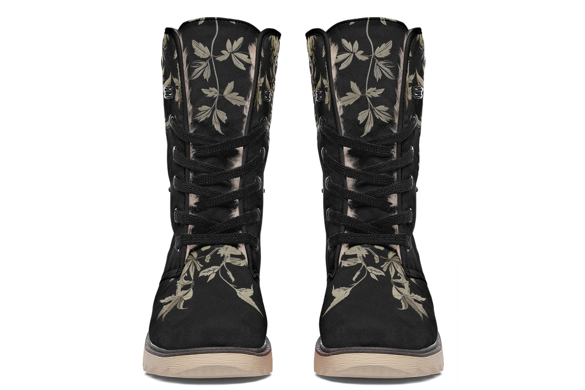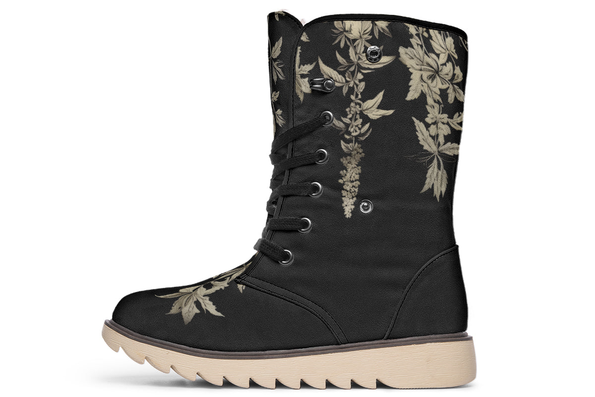 Botanical illustrations cascade over an abyssal black, channeling ghostly flora from a forgotten garden—just the thing for Coven members who prefer their blooms a little bit haunted. Wear them and listen closely; you might catch the boots whispering garden gossip.