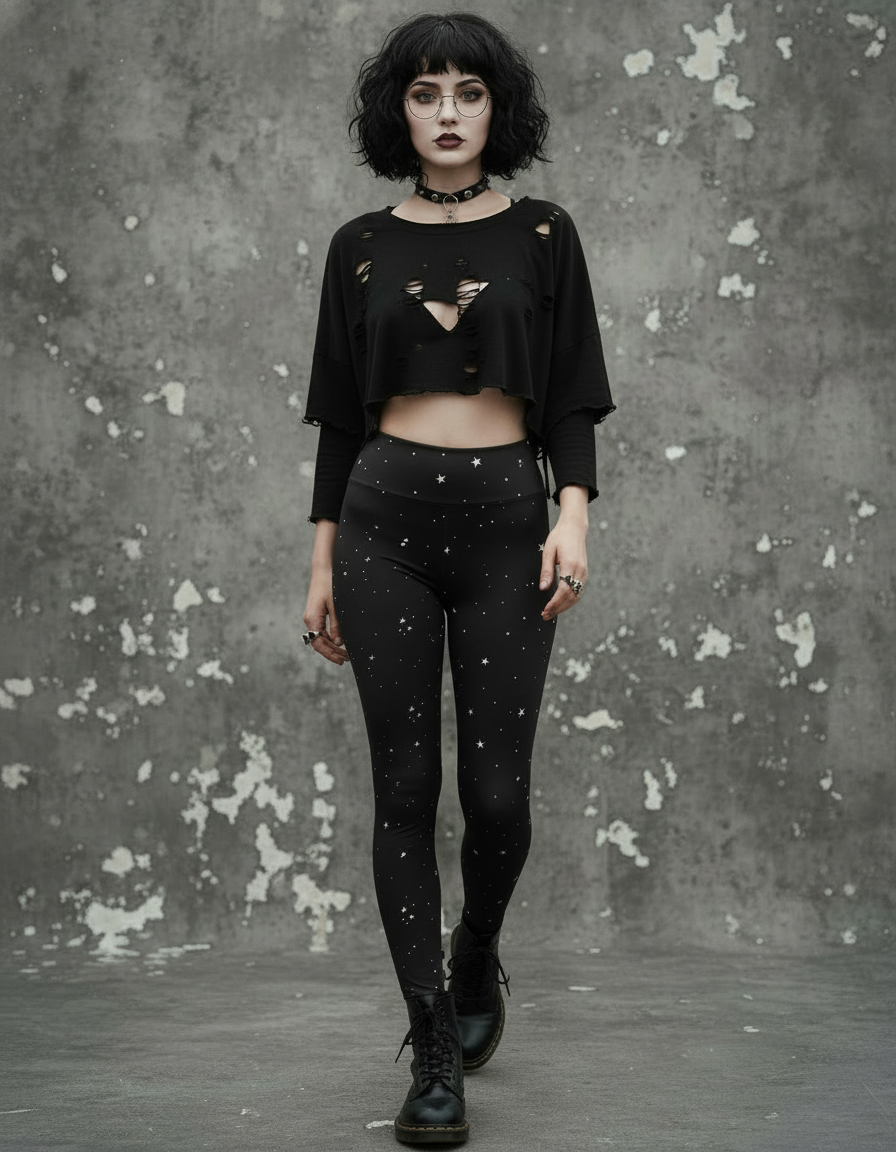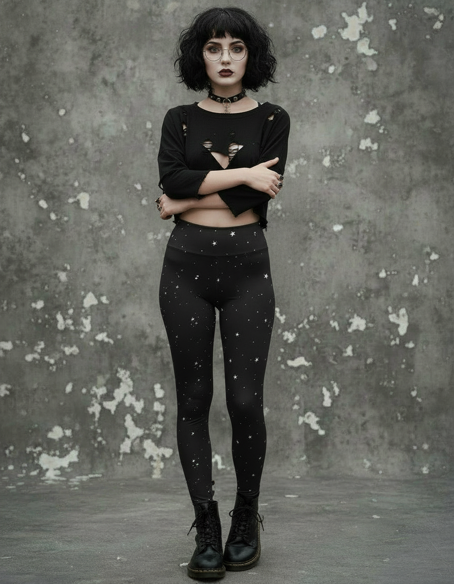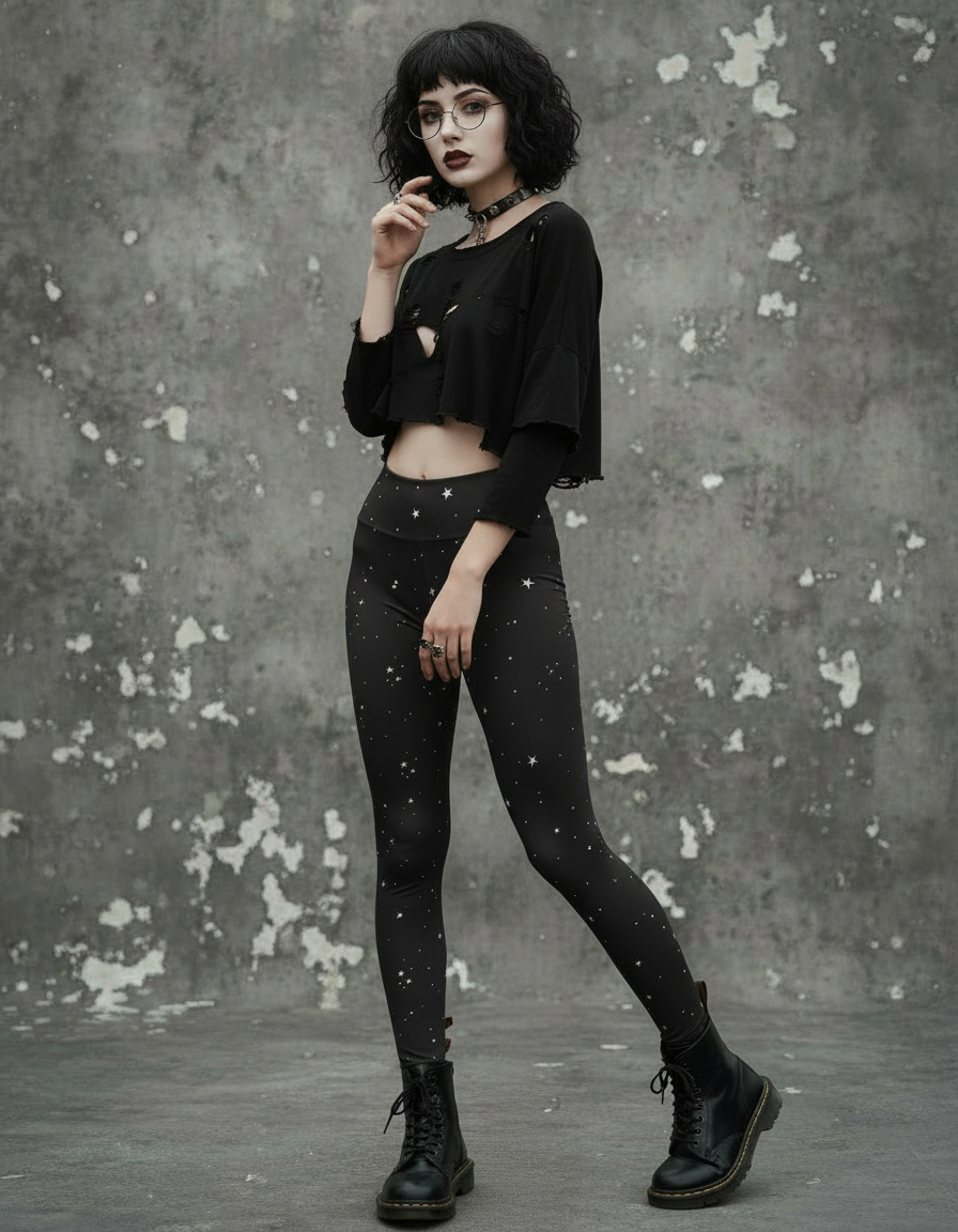 Our Starry Night Yoga Leggings sew an ethereal tale into an alternative fashion canvas. Perfect for the witches of our Coven who live on the edge of fantasy and reality, blending gothic style with workout functionality. Whether you're performing moonlit witchcraft or chilling in a grungy café, these leggings echo a striking balance between style and comfort.