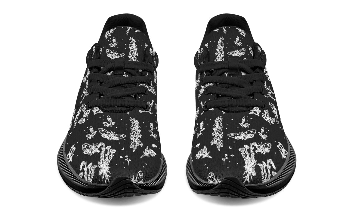 Summon lunar magic to your steps with our Nightshade Sneakers—where moths, flowers, and stars twine together in monochrome dreams.