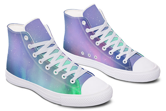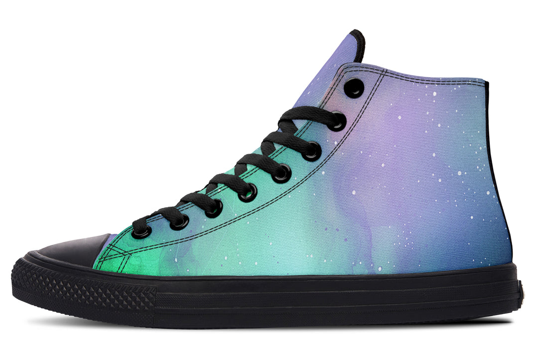 These unisex high tops capture the shifting hues of a dawn sky, with aurora borealis colors of teal and purple dotting the canvas like celestial tattoos. Perfect for embracing your inner gothic stargazer or showing off your witchy style. Step out, and watch the stars align in your favor!