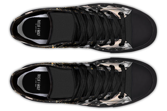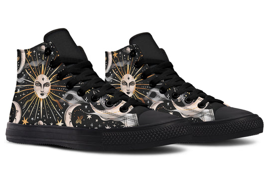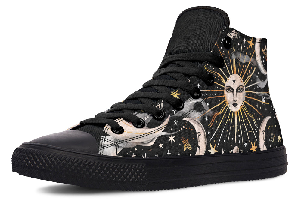Step into a universe of mystery with our Daystar High Tops. These shoes evoke celestial wonder, featuring a radiant sun and phases of the moon set against a starlit sky. Embrace a cosmic journey every time you lace up.