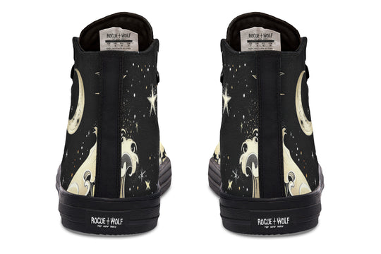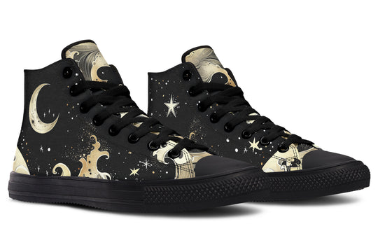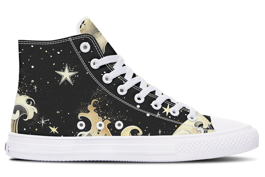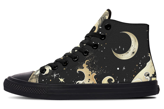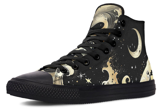 Golden waves erupt on the seas below as the crescent moon shines and lifts the tides on the sky above—step into a cosmic journey every time you lace up. Dive into gothic elegance blended with celestial vibes.
