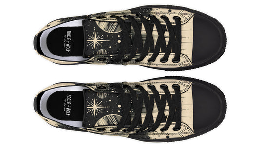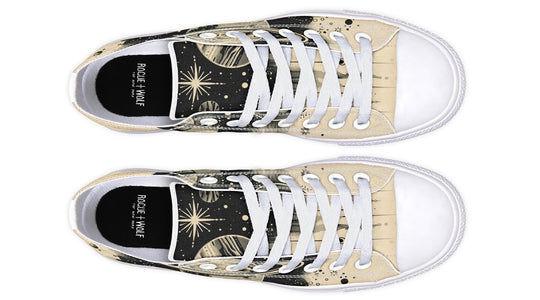 Wander among the stars and planets with every step in these casual low tops, inviting a cosmic journey right beneath your feet. The perfect blend of gothic charm and celestial wonder, these shoes capture the essence of night skies painted on a canvas of black on beige. The Starwalker Low Tops are a portal to the universe, promising adventures unknown.