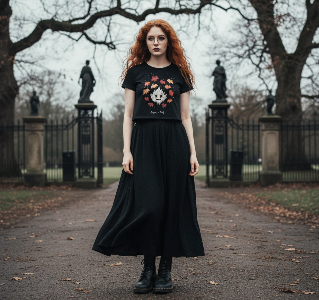 Unveil the mystery of autumn in our Maple Ghosty Short Sleeve Crop Top. Draped in nugoth charm and whimsy cross-stitch style artwork, this piece is a spellbinding fusion of dark academia and cute crop top allure. It’s where ghostly grins meet gothic style, perfect for your next coven convening or a casual haunt around town.