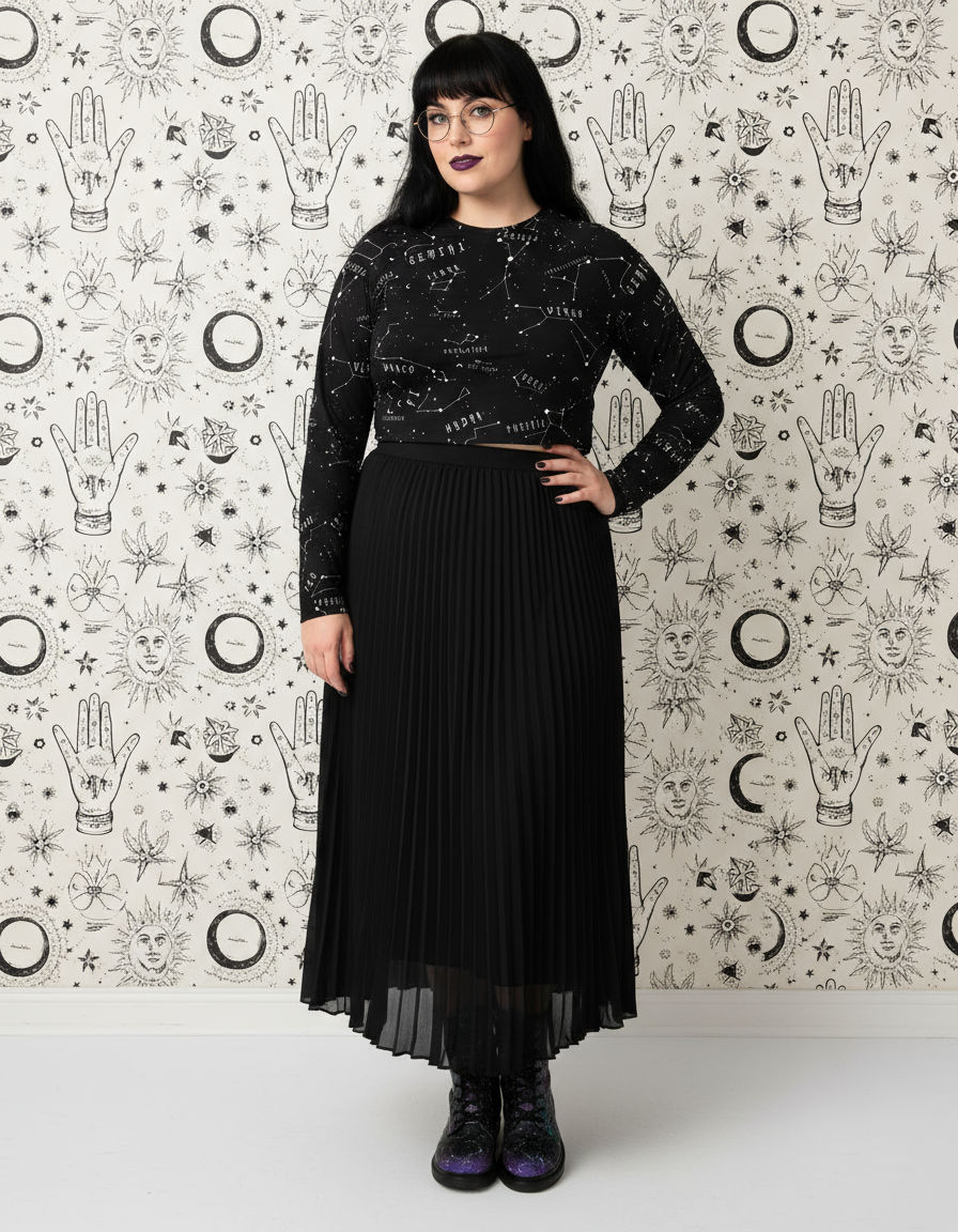 Unveil your inner celestial enchantress with Rogue + Wolf’s Stellar Long Sleeve Crop Top. Every thread is woven with the dark elegance of the night sky, creating a cute black crop top tee that transcends the mundane. This occult fashion piece beckons the universe to drape around you, creating a symphony of gothic style that lights up your galaxy.