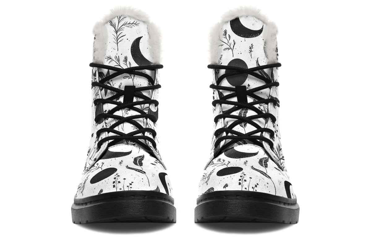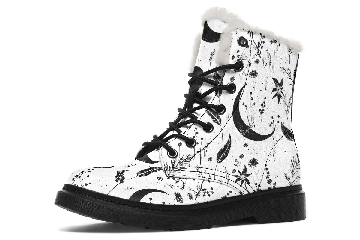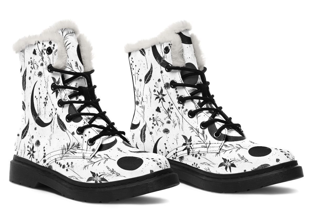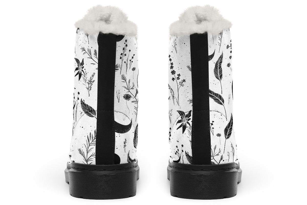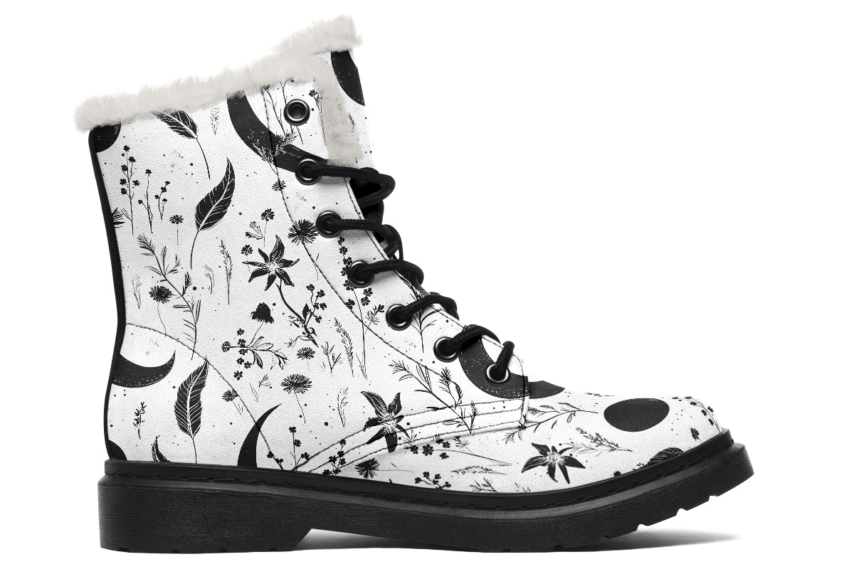 Witch up your winter game with the White Moonlit Botanica Winter Boots—midnight blue moons and magical herbs strewn across a snowy canvas, like a spell gone deliciously rogue.
