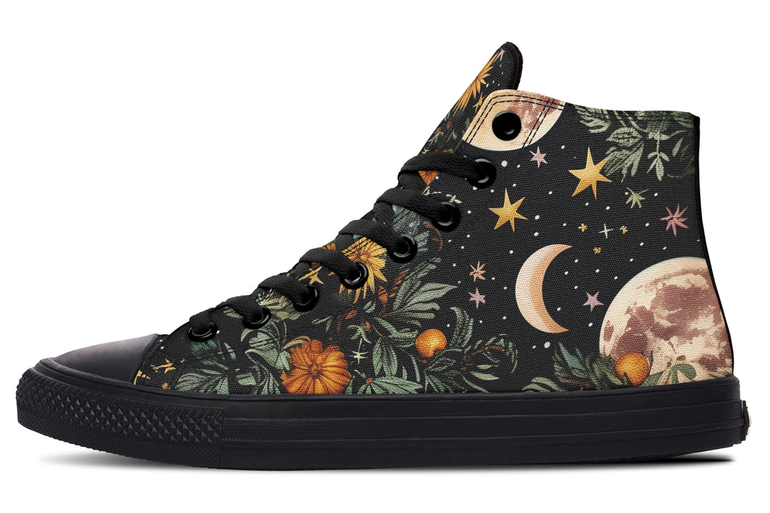 Imagine wandering through a moonlit meadow, where greenery and yellow flowers meet the cosmos. These casual high tops capture the mystical harmony between earth and sky, making them a unique addition to your witchy wardrobe.