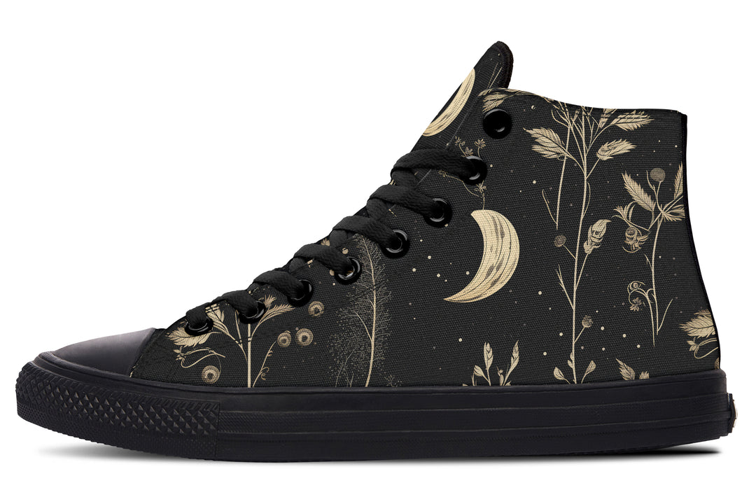 Envelop your feet in the magic of the night sky with our Twilight Garden High Tops, where witchy style meets retro vibes in a symphony of herbs, leaves, and seeds. These canvas high tops are your new familiar for all your moonlit adventures. Don your pair and let the nocturnal essence of nature whisper secrets to your steps.
