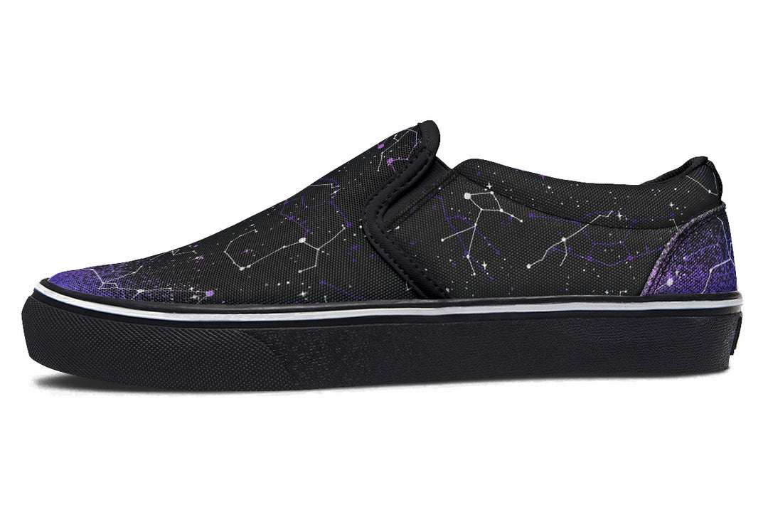 Navigate the cosmos with the Aurora Slipons, where constellations and galaxies shimmer in hues of blue and purple against the midnight sky. These dreamy slip-ons are more enchanting than a witch’s brew, inviting you to explore the universe with every step. Get ready to dance among the stars!