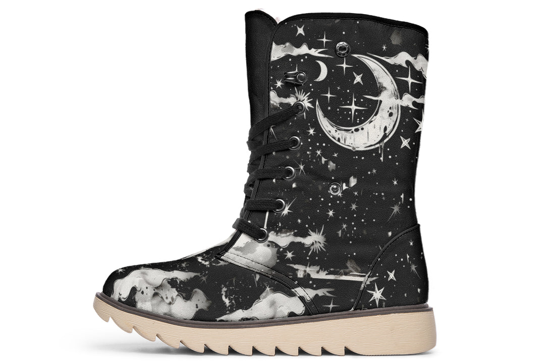 Embrace the enchanting chill of the night with our Nightfall Fold Over Winter Boots, where every step channels the mysteries of the cosmos. Designed with monochromatic celestial themes, these boots are more than footwear—they’re your ticket to a starlit journey.