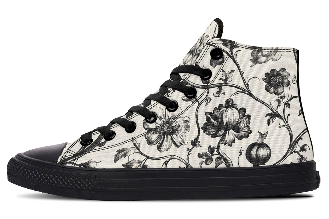 Step into the twilight with the Baroque High Tops—where swirling black vines and haunting florals weave a spell over a stark white canvas. It’s like wearing a gothic waltz on your feet, perfect for unwinding the mundane and summoning the extraordinary. Ready to haunt every hallway, witch?