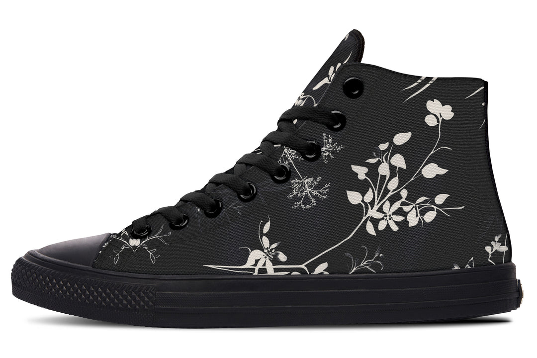 Step between worlds in a pair of Black Delicate High Tops – where hauntingly elegant flora twist through shadow, and you’re always two steps ahead of the mundane.