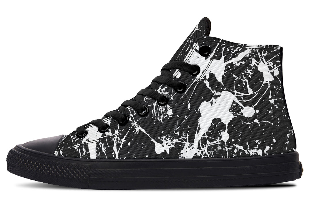Unleash your shadow side with high tops splattered in wild white ink like a midnight ritual gone rogue. The volatile art is all about harnessing chaos—because who wants a tame wardrobe when you could conjure storms?