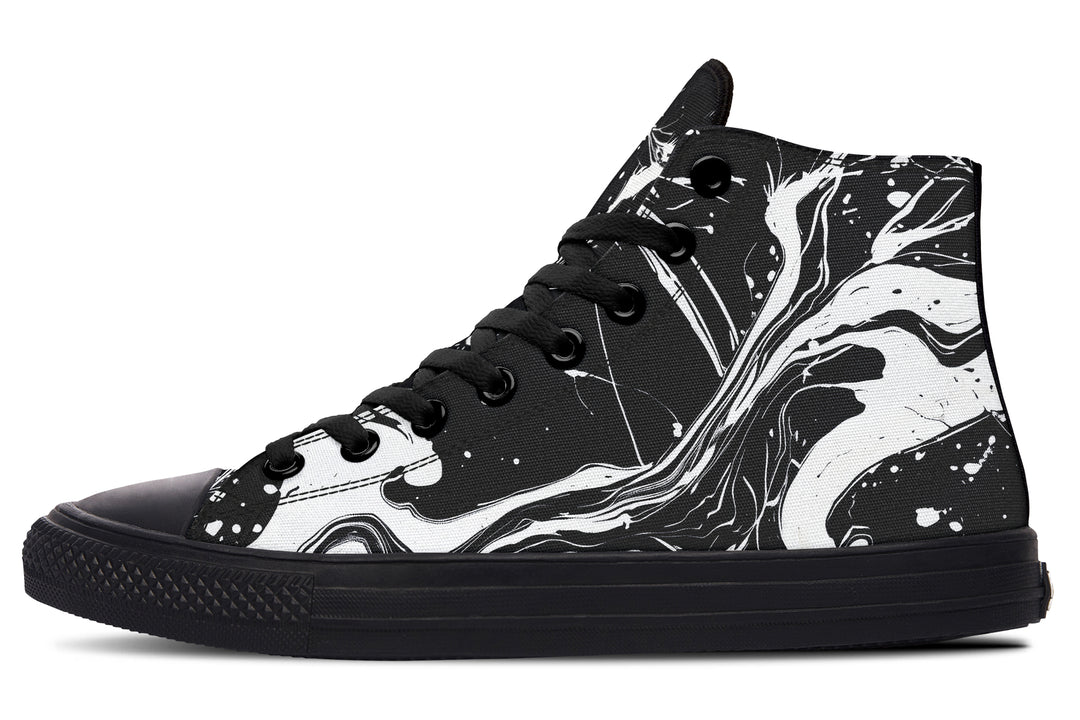 White ink streaks and splatters tear through a shadowy abyss, perfect for witches who like their darkness with a splash of dramatic flair. Slip on these high tops and let your aura whisper, “I’m with the Coven, and yes, we’re recruiting.”