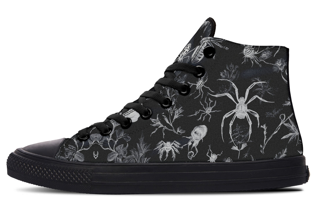 Summon the shadows in style: Black Widow Garden High Tops weave spectral spiders and bone-pale leaves onto void-black canvas for a walk on the witchy side.