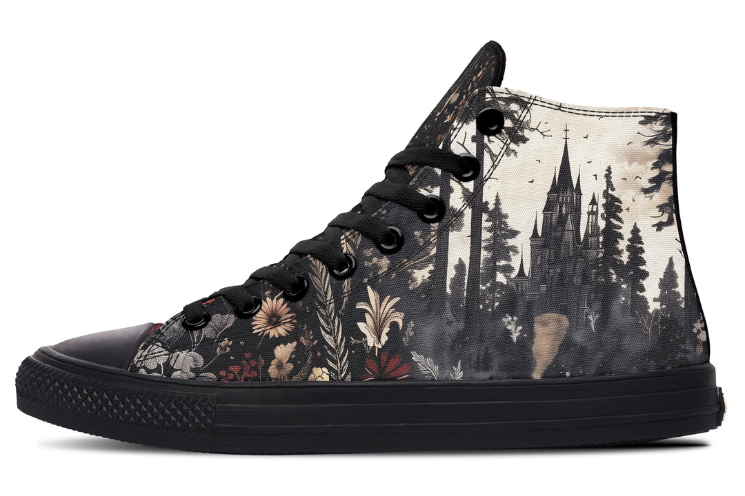 Step into tales untold with these Dark Fairytale High Tops; where gothic castles whisper ancient secrets beyond shadowed trees. Feel the allure as muted florals mingle with haunted spires, creating a dance between life and darkness. Perfect for those late-night forest wanderings or just ruling your neighborhood.