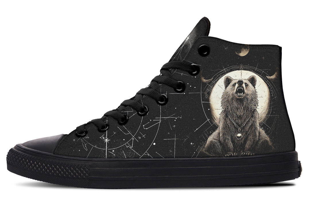 Step boldly into the mystical realm with our Lunar Bear High Tops, where a mighty bear roars under a glowing full moon, joining the cosmic dance with celestial symbols and constellations. Channel the raw power and primal connection of the night as strength meets mystery in every step.