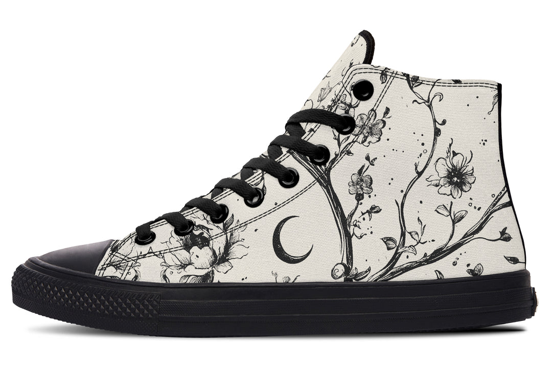 Float through the night with our Night Stroll High Tops—where tangled florals and cosmic moons conjure a dreamscape for your feet.