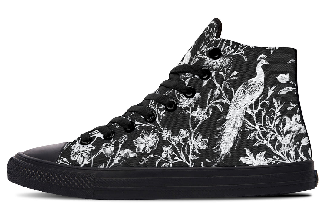 White peacocks glide through a faded blue twilight, twisting through branches and florals—like a secret garden for midnight royalty (or just a really stylish witch). These high tops channel gothic elegance with a side of mysterious garden party. #ShadowedGardenVibes