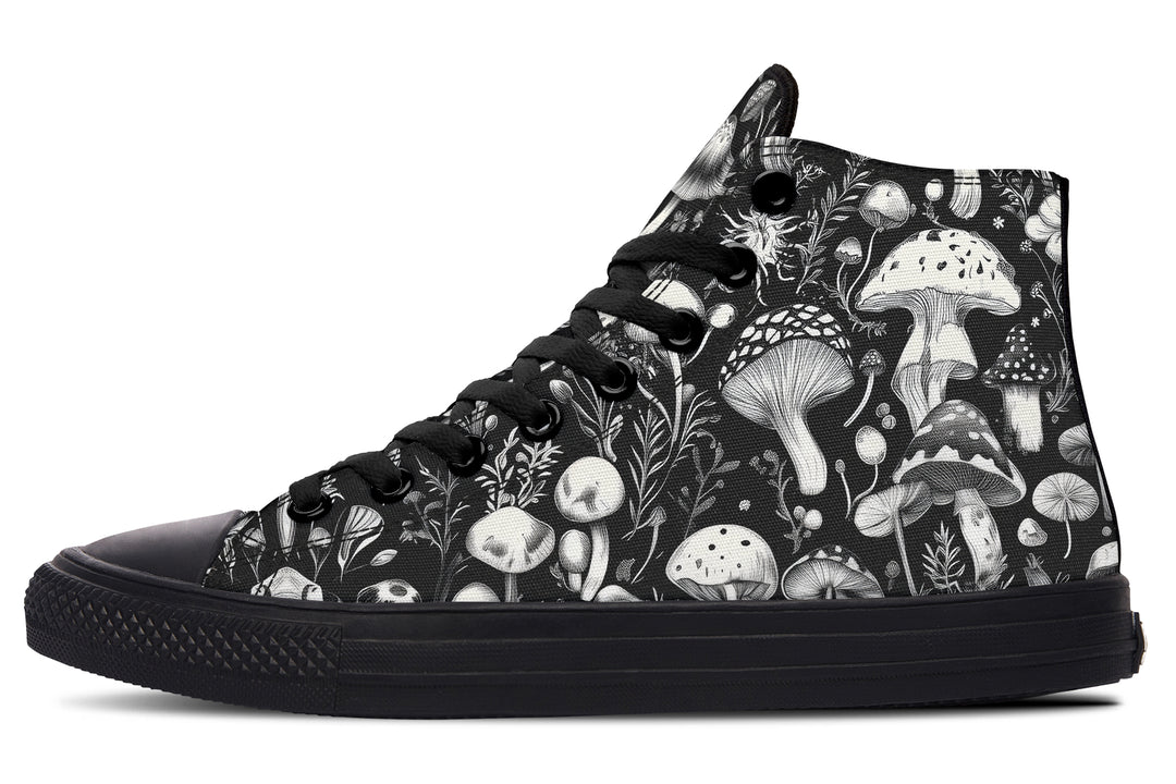 A tangled riot of mushrooms and ferns coils over these High Tops, channelling the secret chaos of the woodland floor—where what’s hidden is always alive, and nothing is as innocent as moss. Feeling witchy or just avoiding humans? Either way, these kicks have your back.