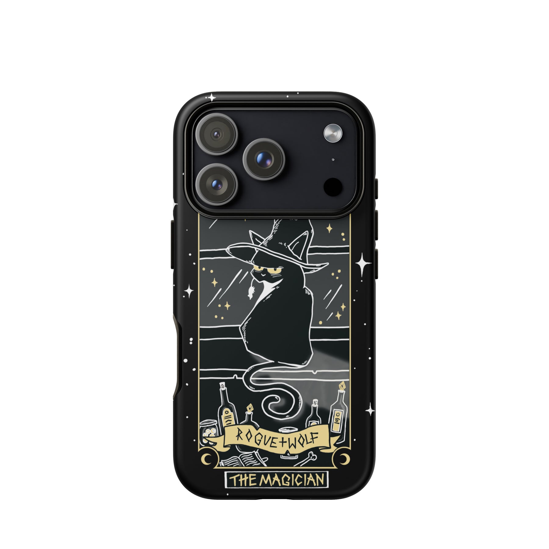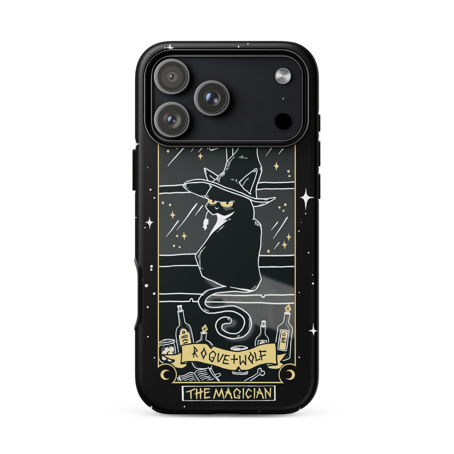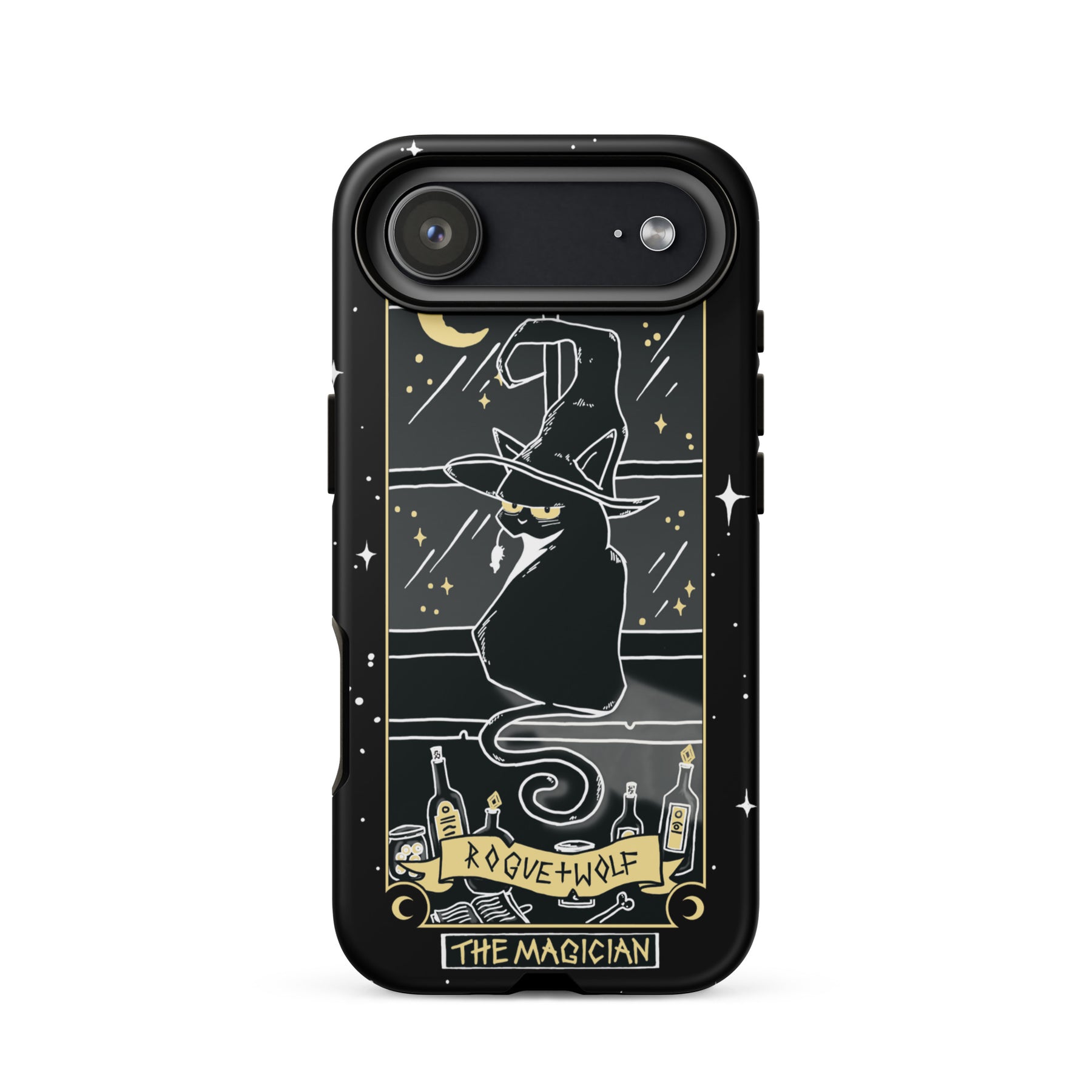 A black iPhone case featuring a tarot card design with a black cat, stars, and text elements.