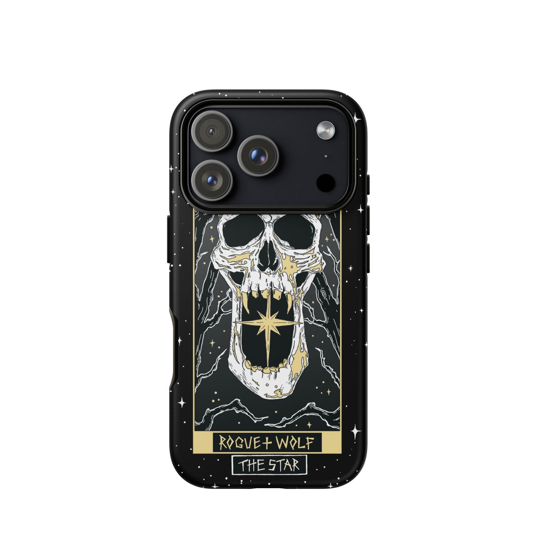 A phone case with a gothic design featuring a skull and star motifs, predominantly black with gold accents.
