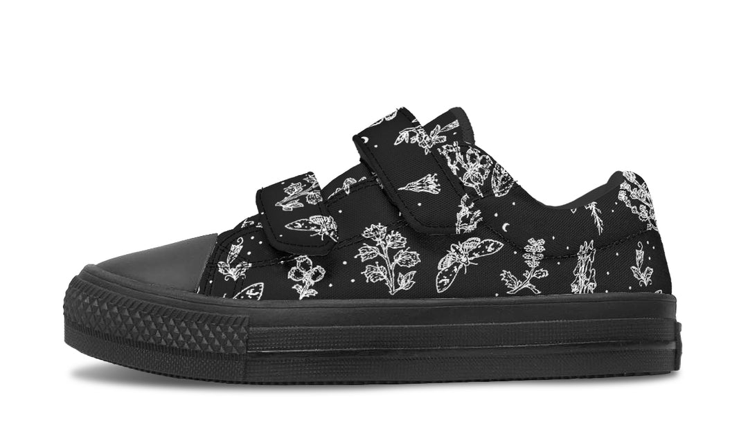 Summon the whimsical wonder of the night with our Nightshade Kids Low Tops! Featuring a mystifying moth, enchanted flowers, and twinkling stars, this black and white pattern casts a spell of curiosity and creativity on every young witch or wizard. Let your child’s style soar to new mystical heights.