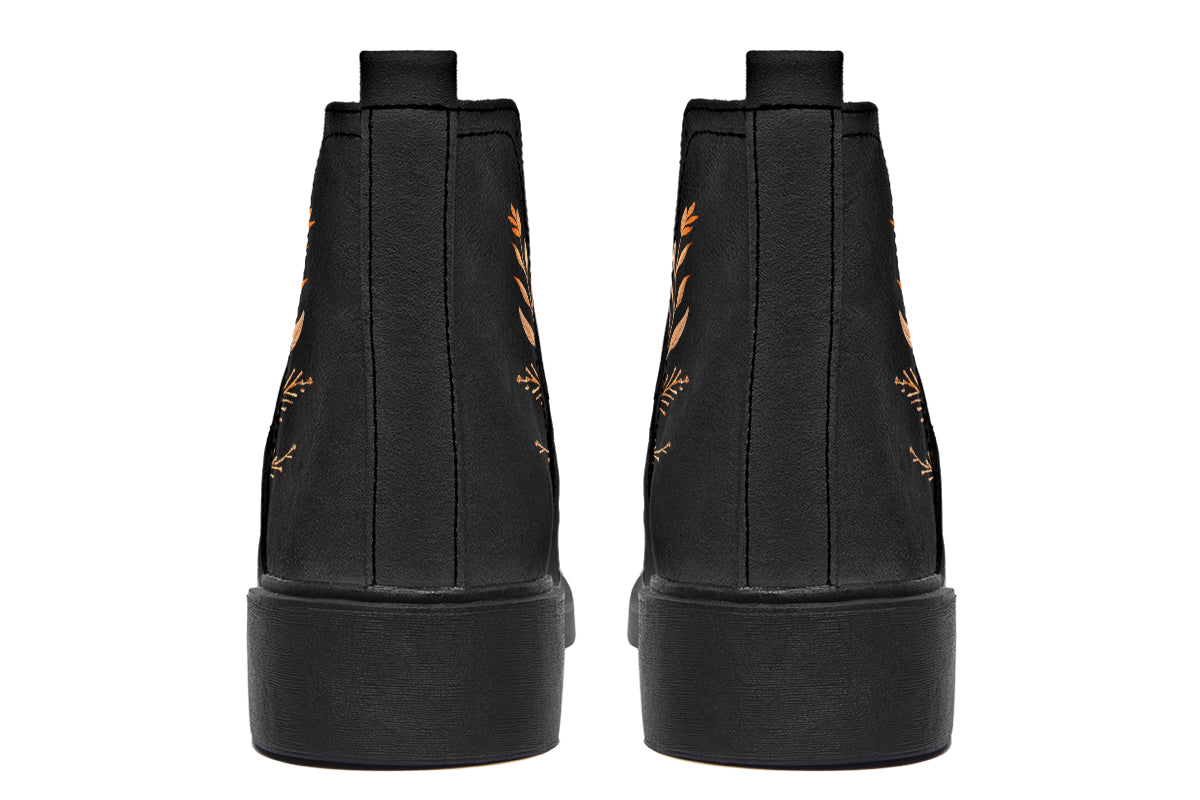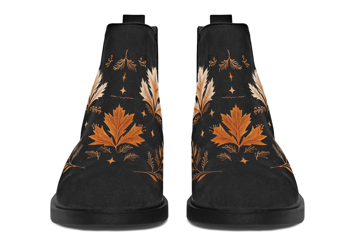 Step into a witch’s study as you wander the city—these boots scatter pressed autumn leaves in copper and gold across an inky black canvas. The Autumnalis Chelsea Boots were conjured for misty mornings and moonlit strolls, when the ghost of Autumn follows at your heels. Join The Coven, and leave a trail of occult vibes (and maybe leaf prints) wherever you roam.