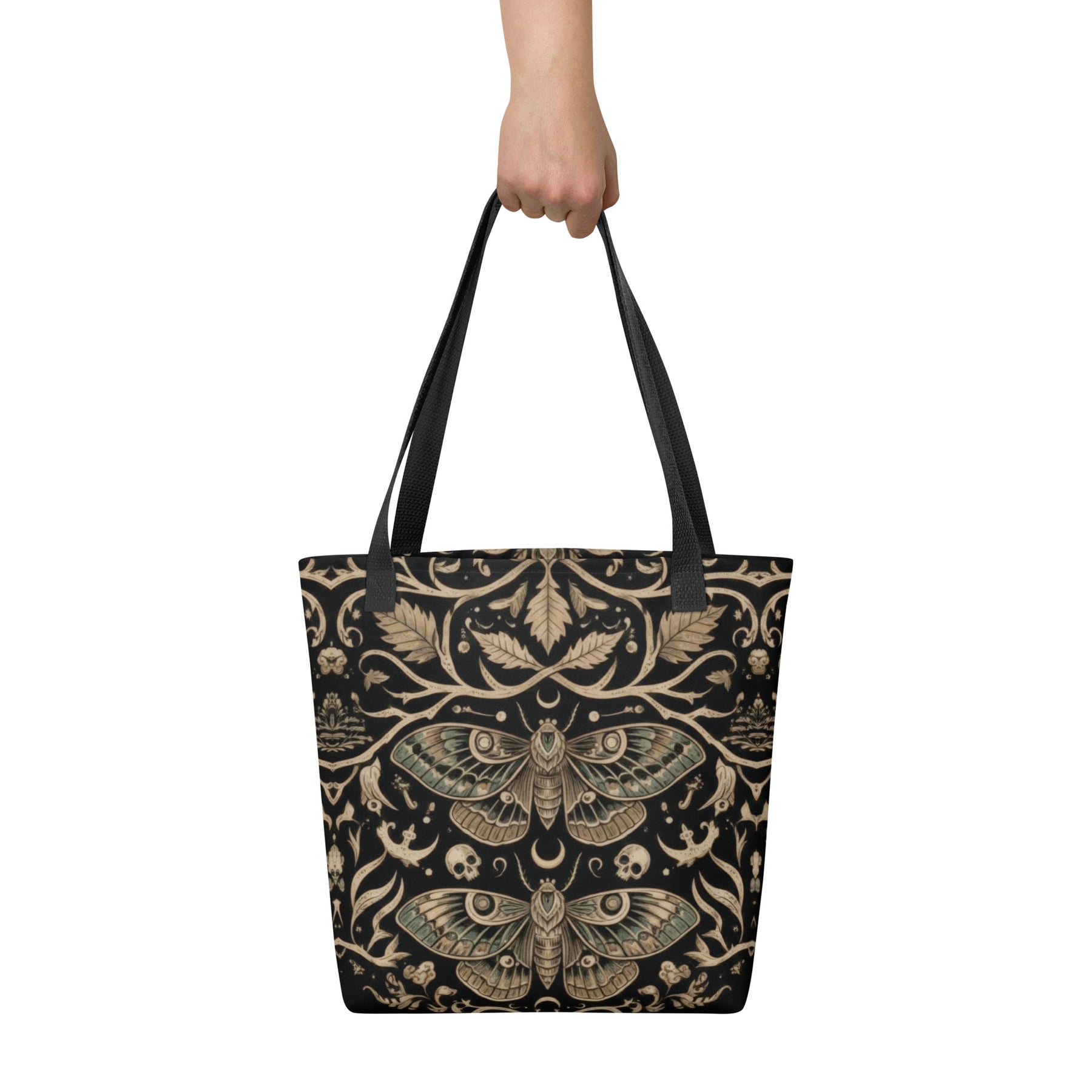 Moths, crescent moons, and delicate skulls swirl in a gothic dance—like a bestiary’s fever dream scribbled by moonlight. This tote is all about death, rebirth, and carrying your spellbooks or (let’s be real) snacks. Witchcraft meets grocery run—who said rituals can’t be cute?