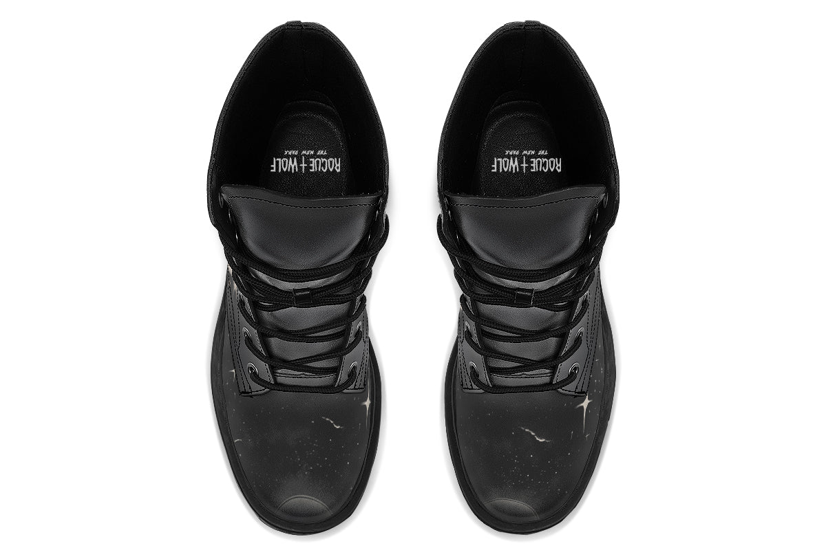 Looking like you just soared from a midnight séance, these platform boots wrap your feet in occult elegance, starring shadowy bats and swirling clouds. Perfect for hauntings, moonlit strolls, or making a subtle exit at mortal parties—because sometimes you just gotta ghost, right?