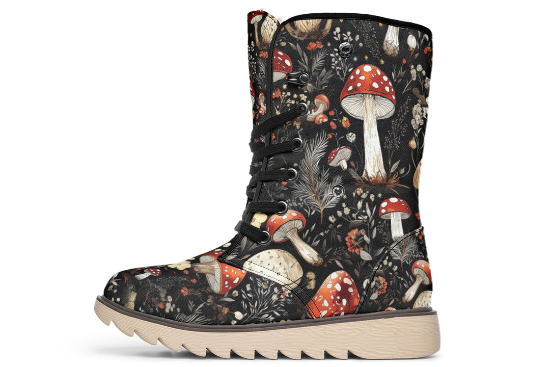 Venture into the mystical woods with every step in these spellbinding fold-over winter boots. Adorned with enchanted red and white mushrooms, they invoke a secret woodland where magic and nature dance beneath the moonlight. Slip them on and discover where the trail runs cold before your next hex!