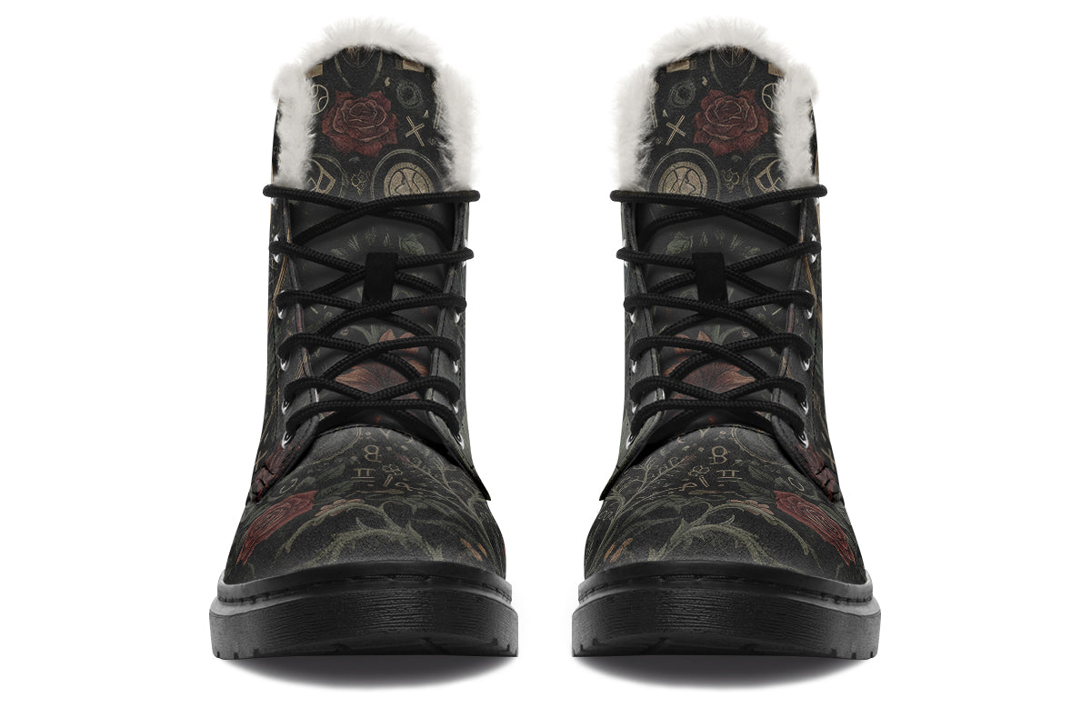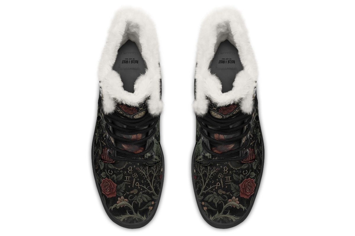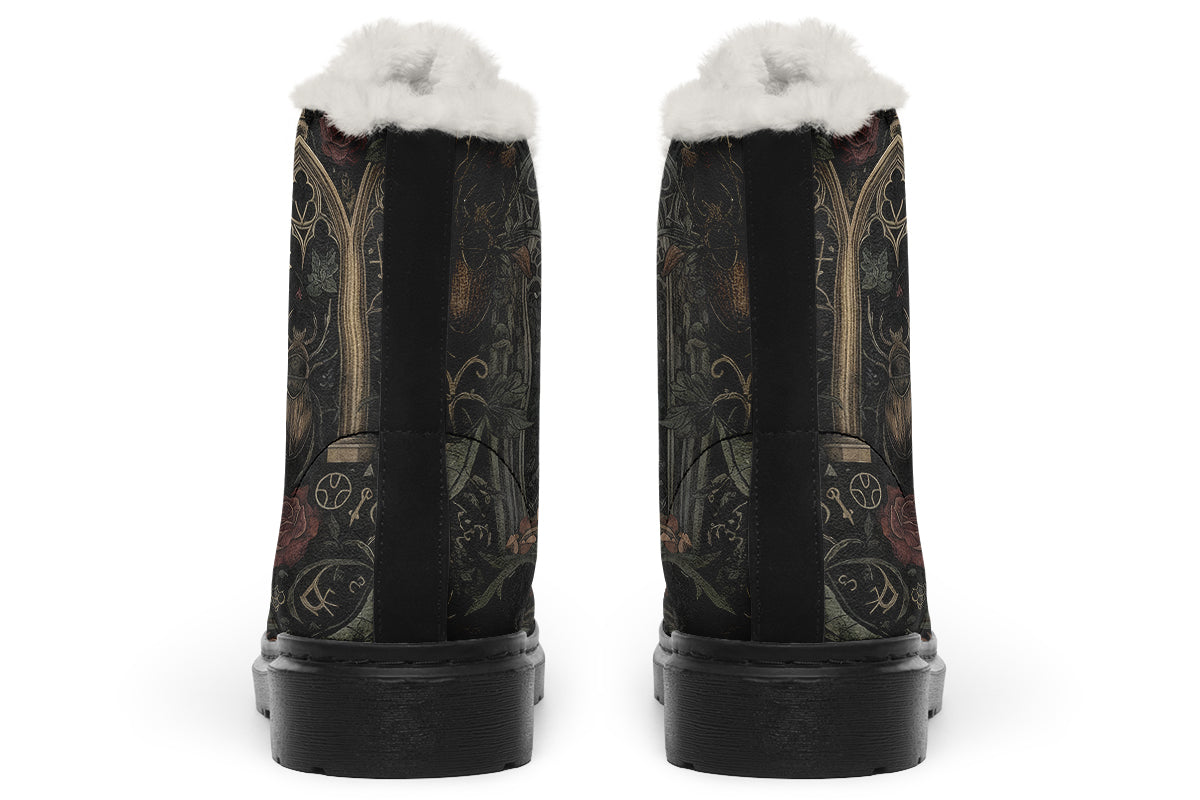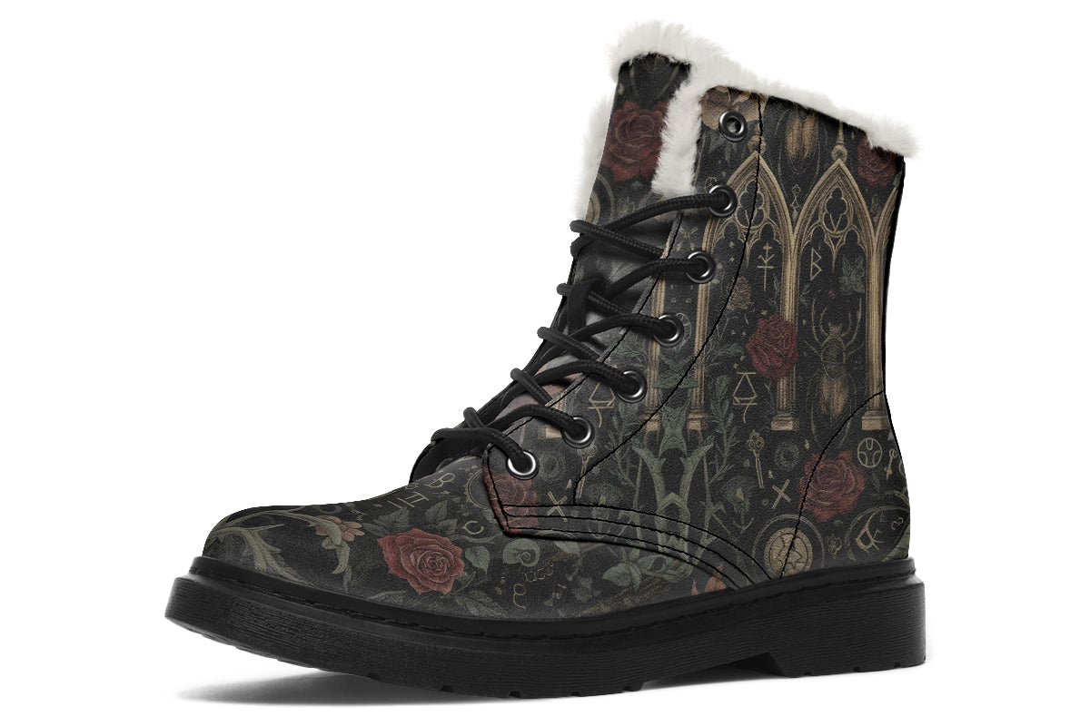 Step through arched cathedral windows etched in shadowed greenery and roses; it’s basically a library where the only thing overdue is your next adventure (possibly at midnight). These gothic winter boots summon secret society vibes for wayward witches and scholarly night-dwellers.