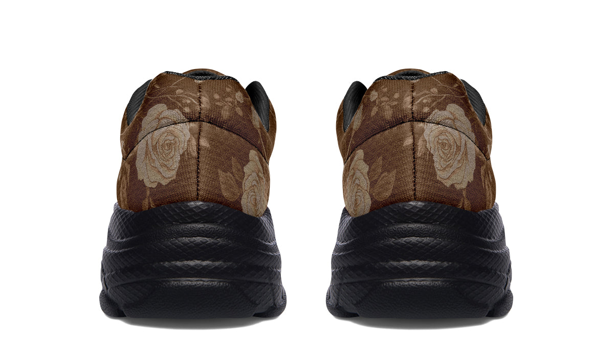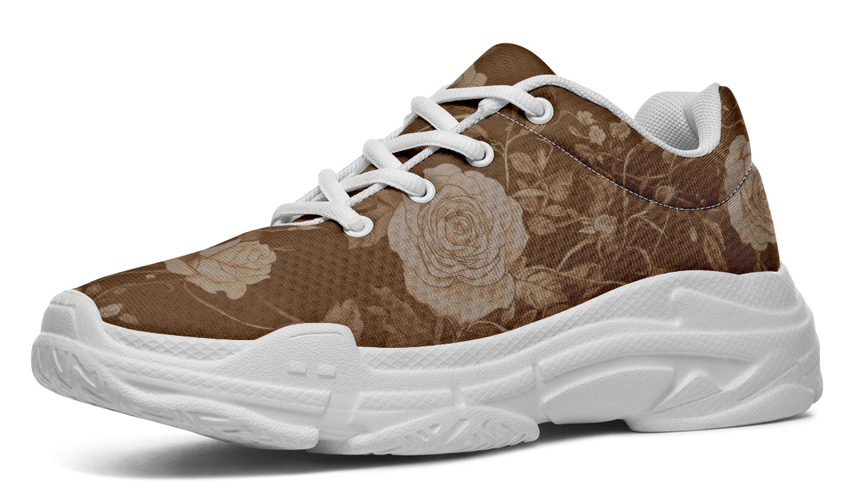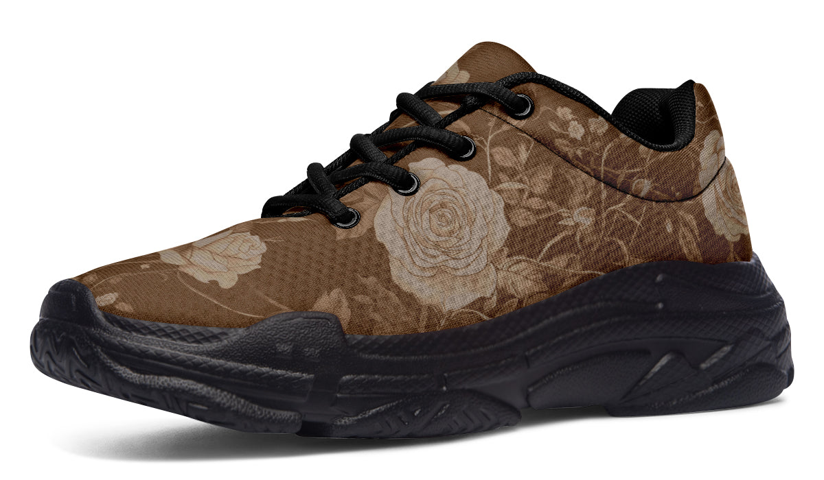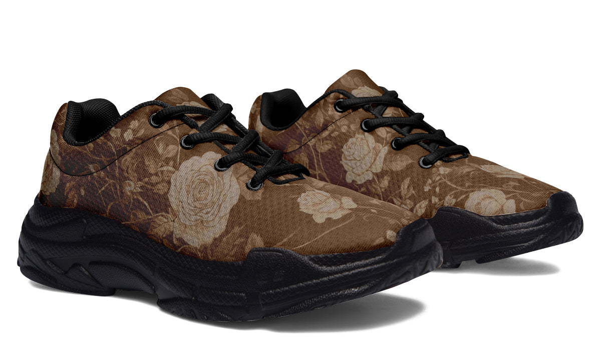 Sink your claws into the Hazel Rose Romance Chunky Sneakers—where soft ivory roses coil through gothic vines on a rich, coffee-toned world. Serving earthy warmth and subtle, witchy elegance, they’re basically the footwear equivalent of tarot cards at dusk.