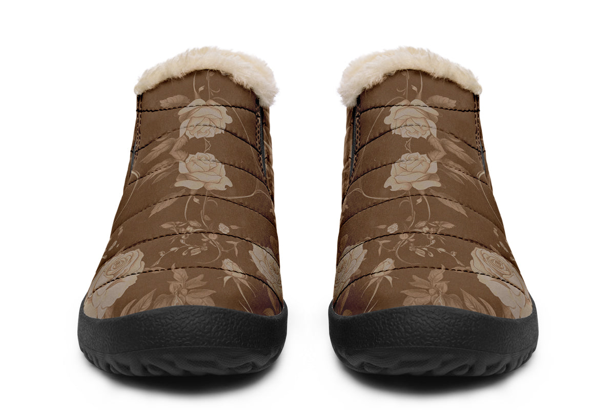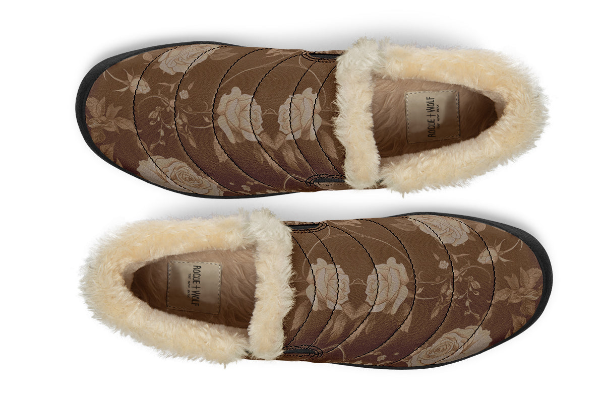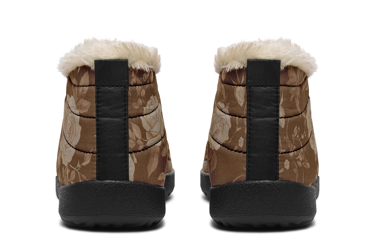 Step softly into the season wrapped in gothic elegance—soft ivory roses and delicate vines winding through an earthy, coffee-toned winter dream, perfect for moonlit strolls or secret Coven meetings. No summoning circle required; just lace up and let your spellbound style do the talking.