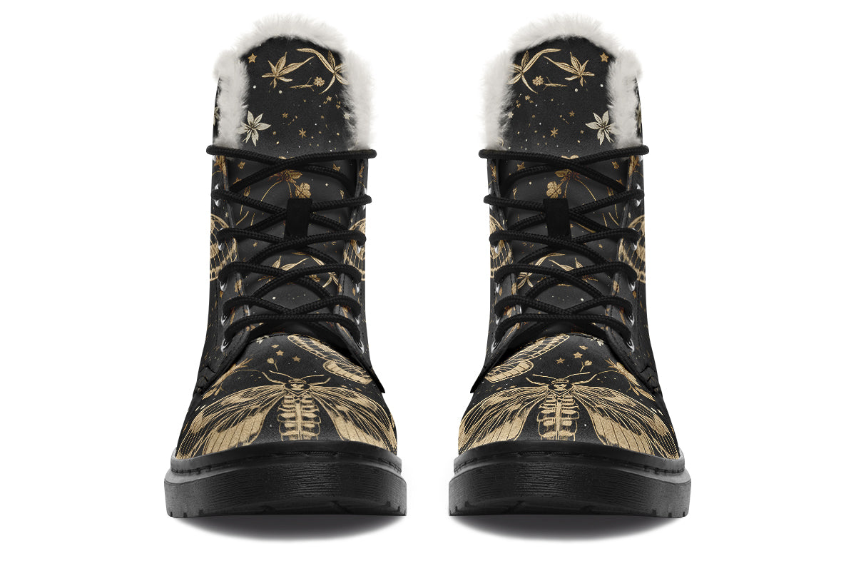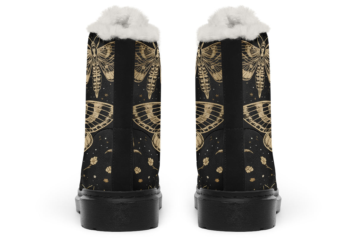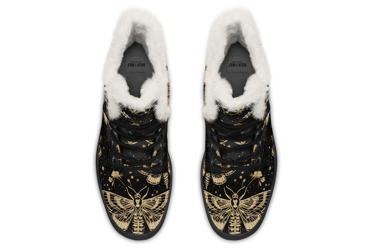 Moth Arcana Winter Boots: Step into the night with parchment-gold moths and midnight flora.