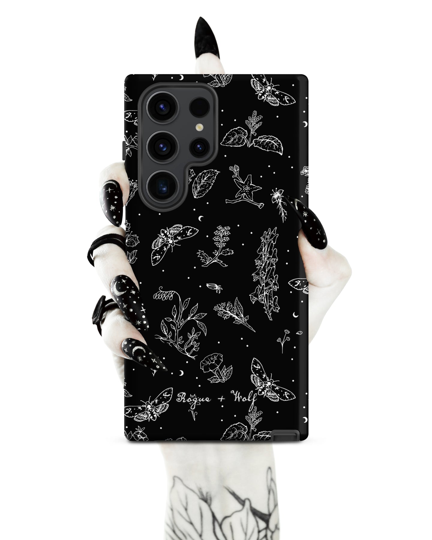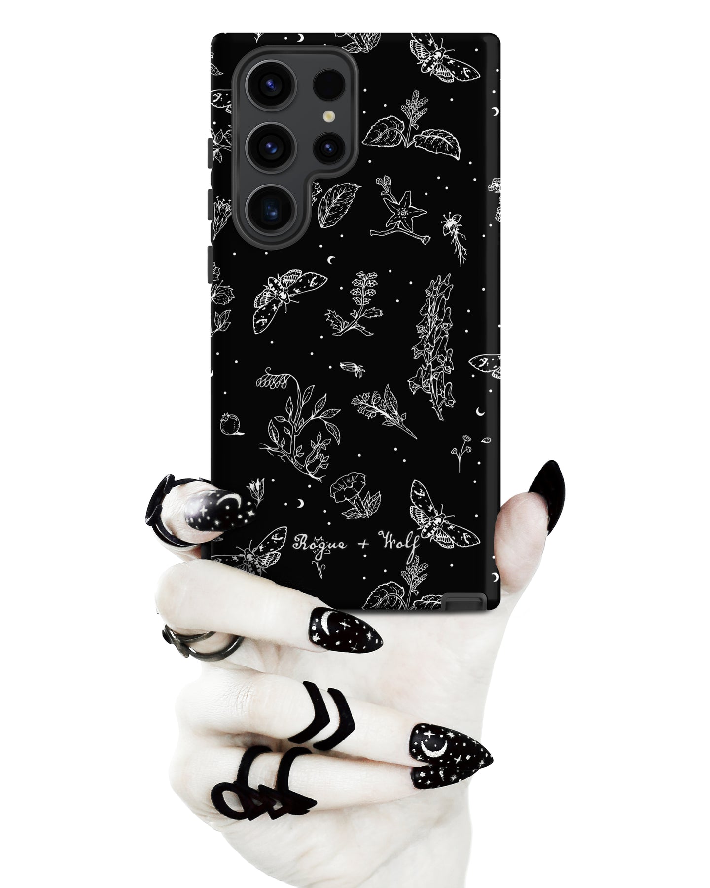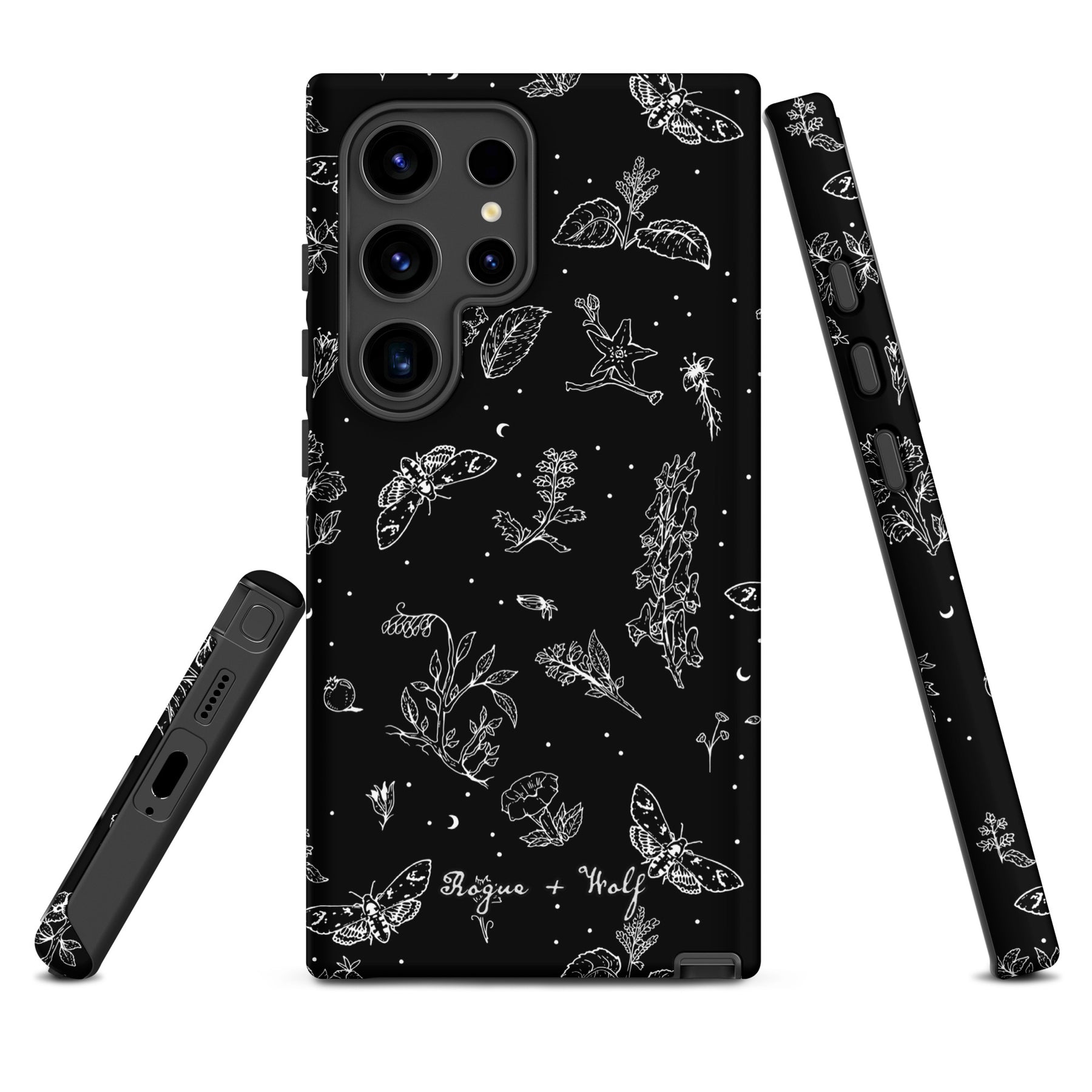 Wrap your phone in gothic charm—our Nightshade Tough Phone Case for Samsung is a spellbinding blend of moths, flowers, and celestial stars.