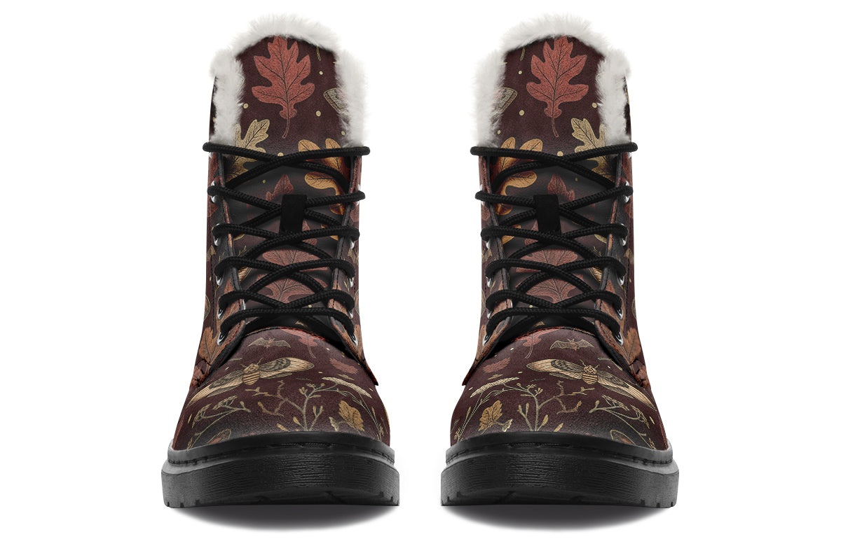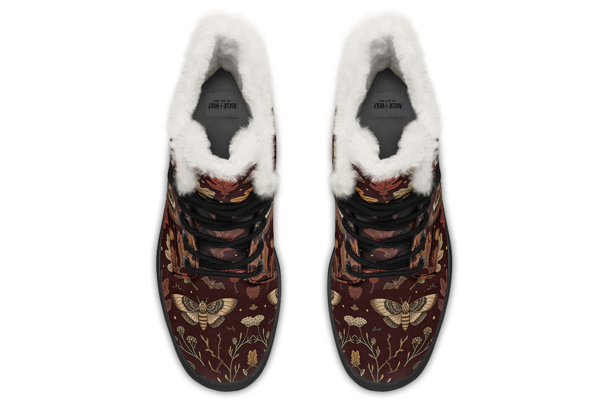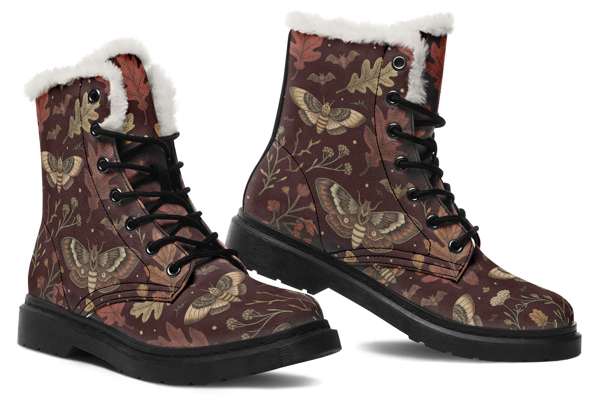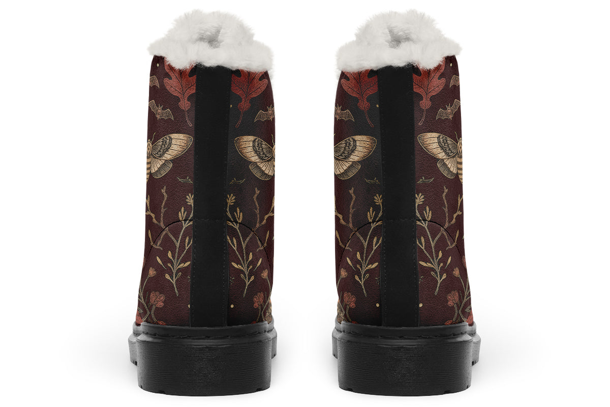 Step into twilight’s embrace with Oak Shadow Winter Boots—where nocturnal moths, bats, and fallen leaves dance across a bewitching burgundy dusk.