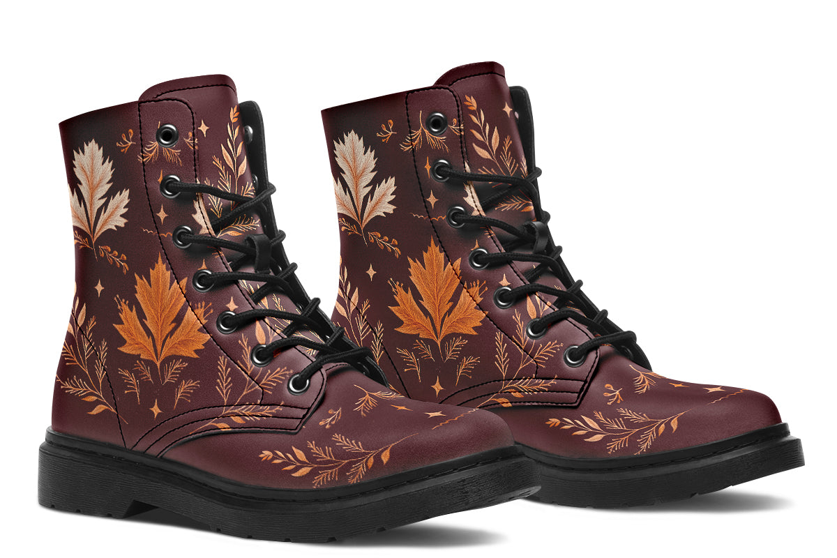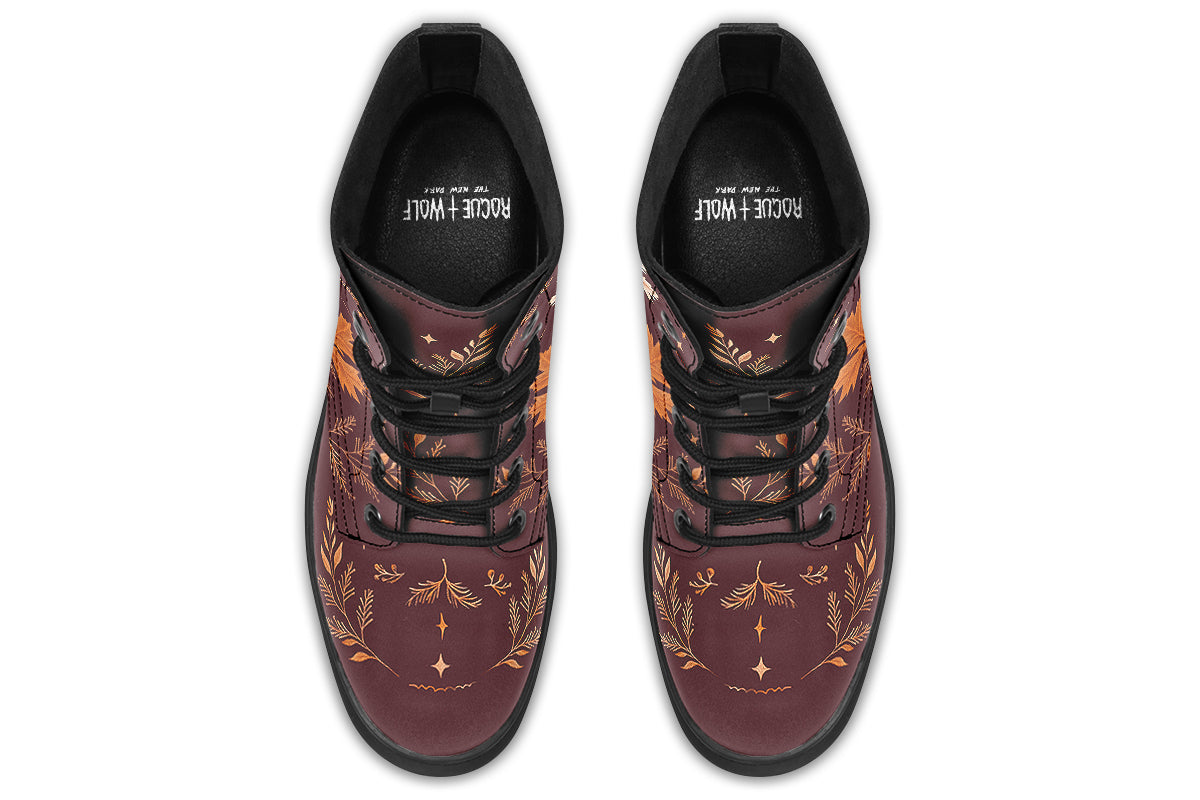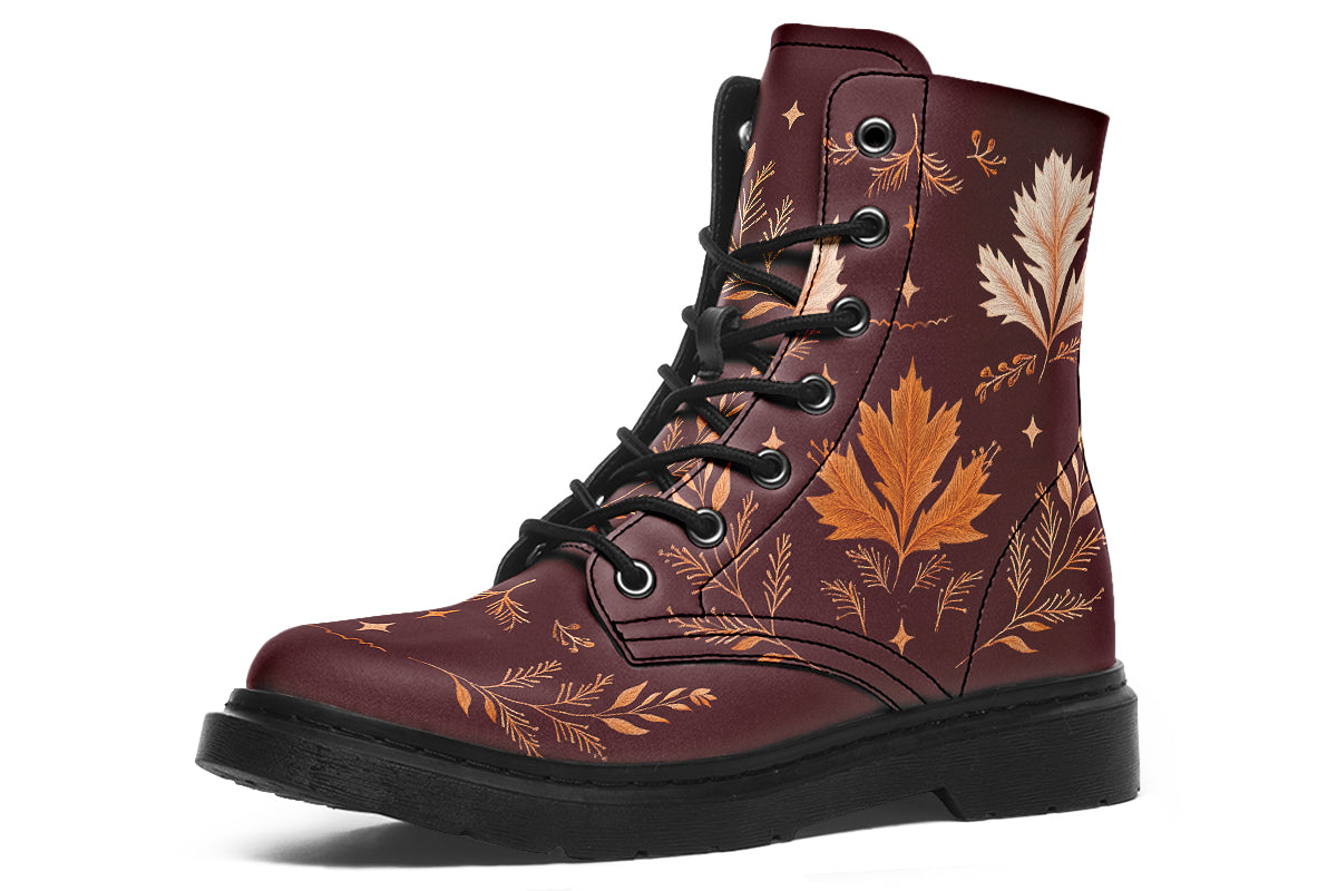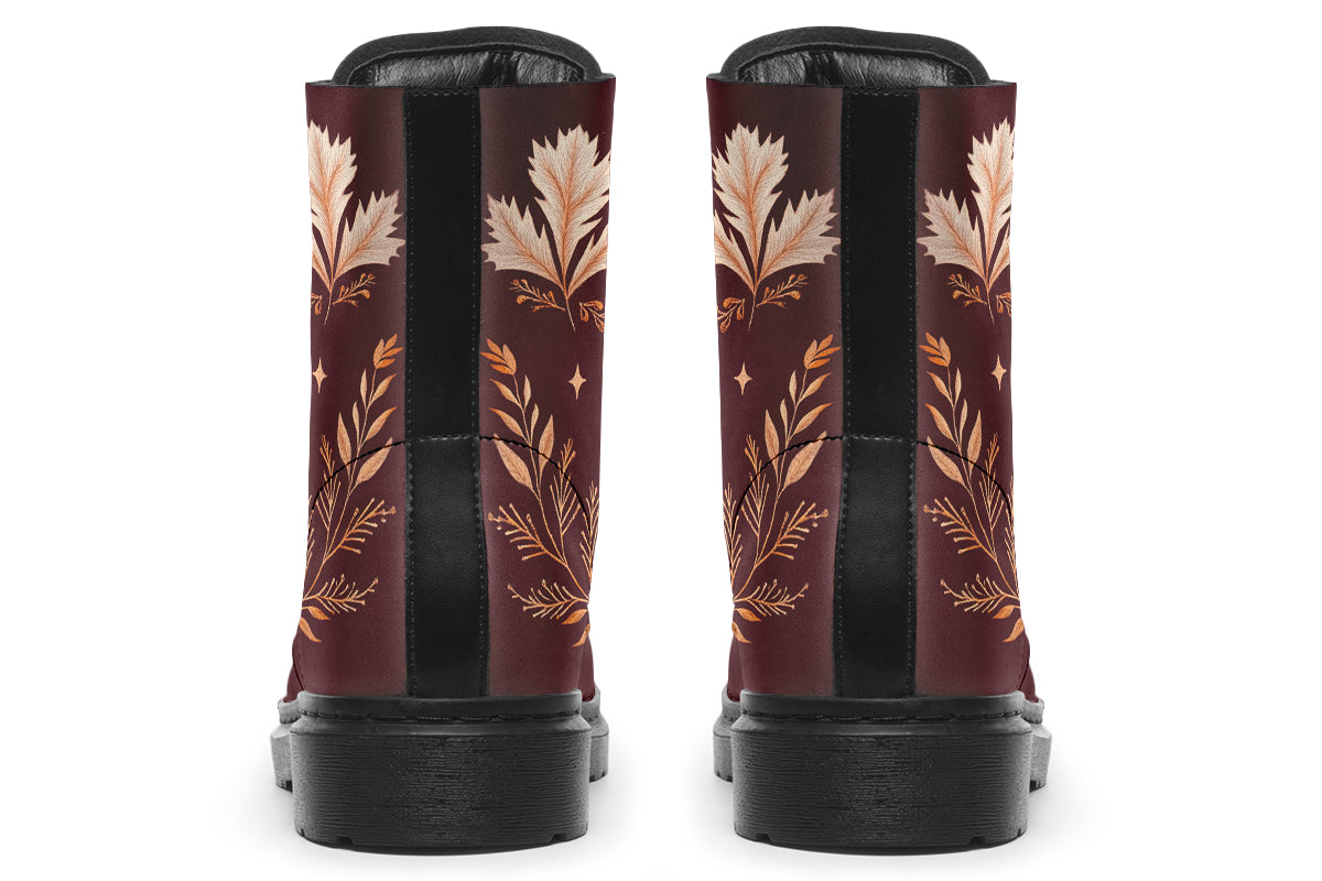 Golden leaves and slender branches enchant these oxblood gothic boots, weaving an atmosphere where cozy autumn crypts meet botanical witchcraft. Perfect for strolls through haunted forests or the “dark academia” aisle at your local apothecary. #LeafItToMe
