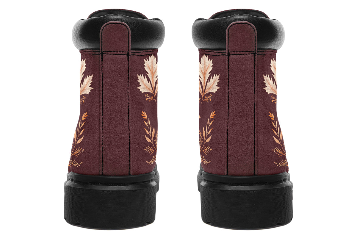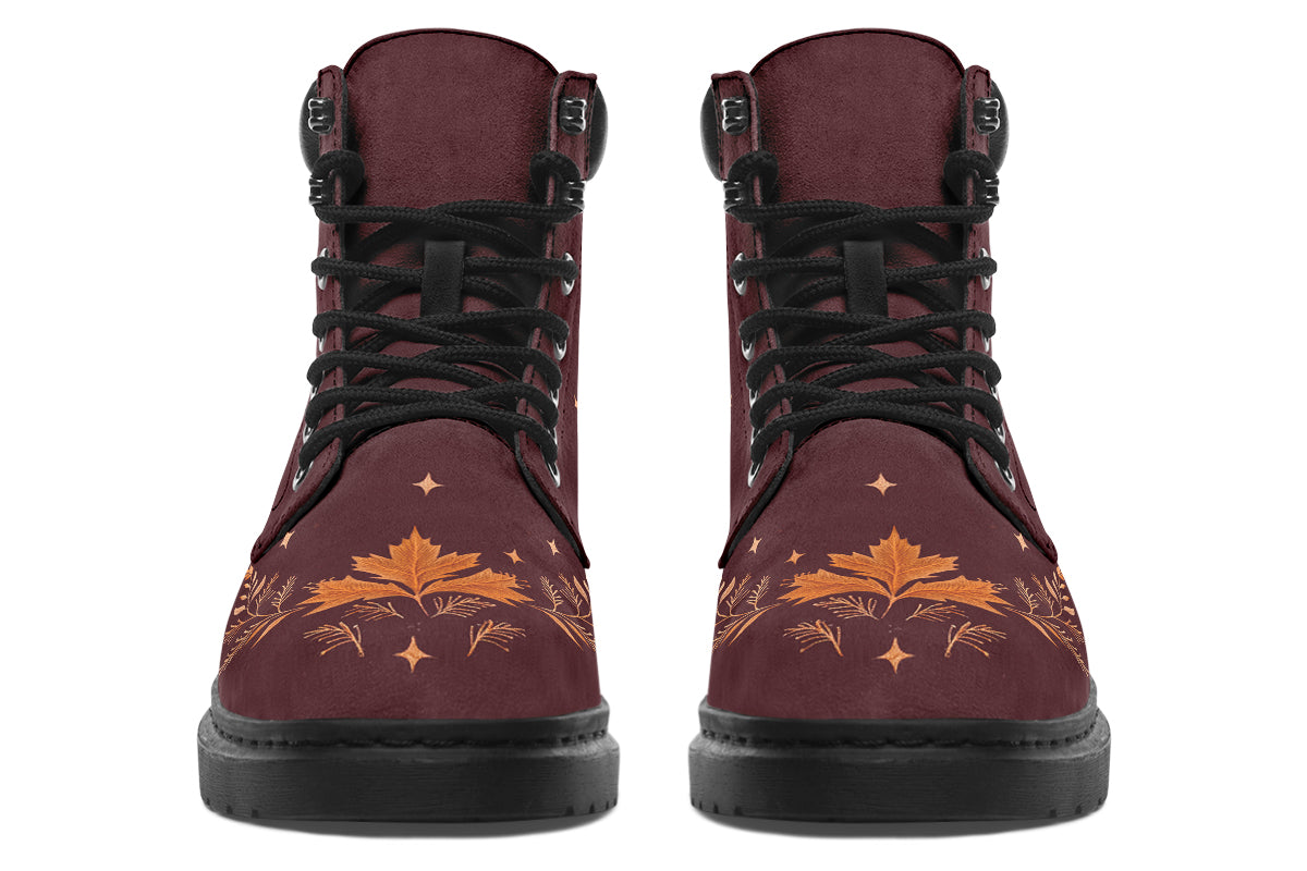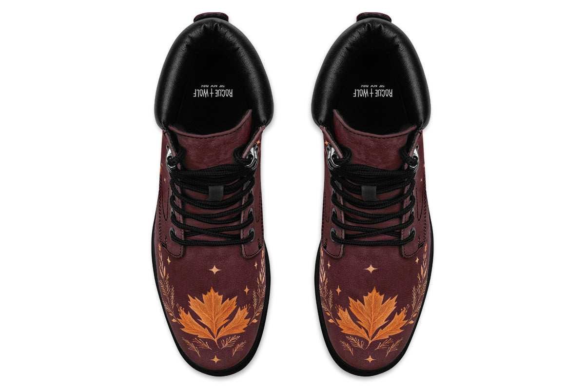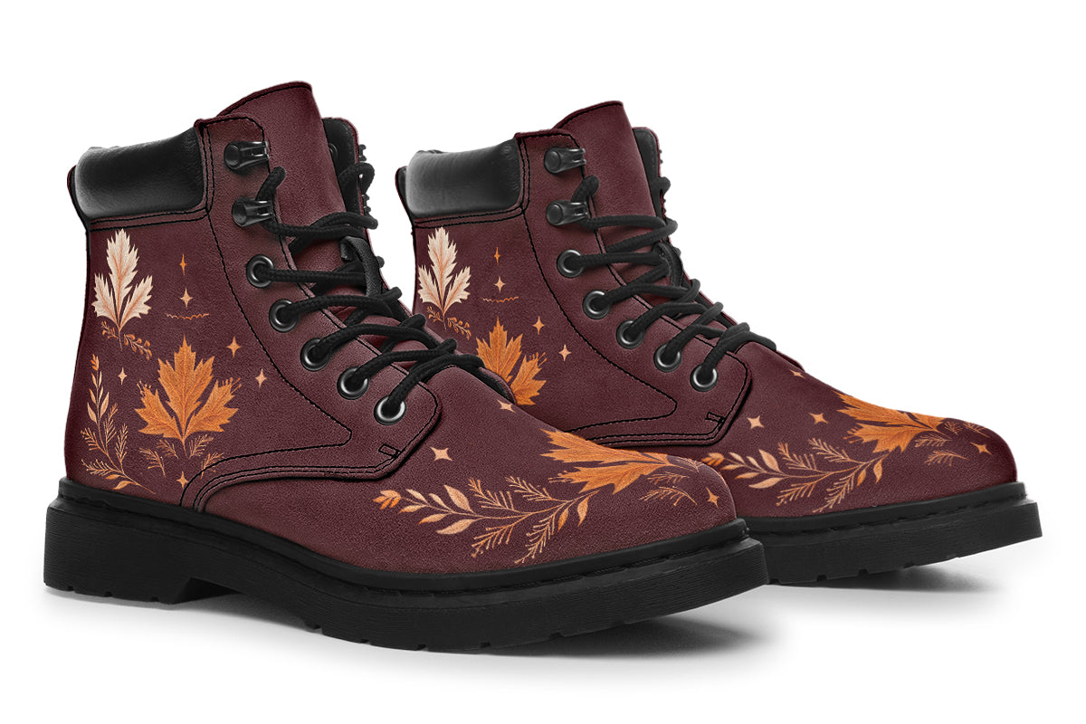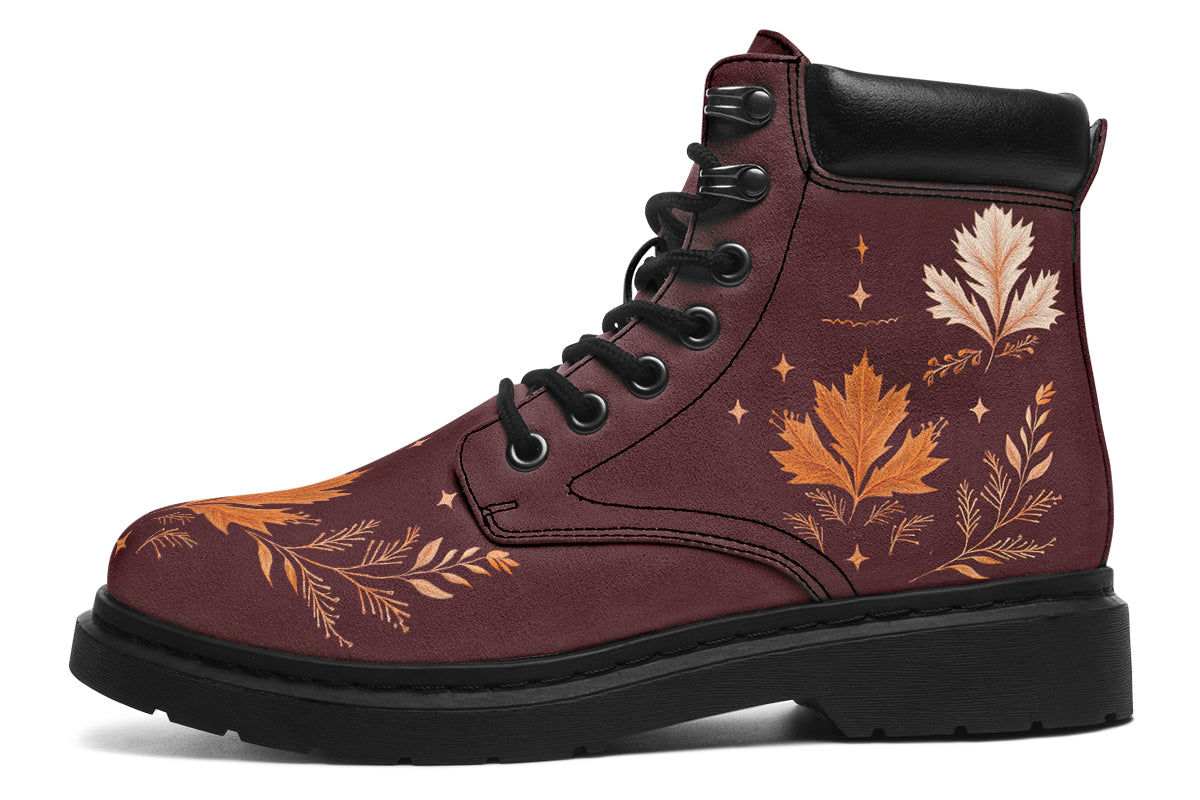 Golden fall leaves and delicate branches dance across a deep oxblood canvas, like your secret herbarium pressed between midnight spells. It’s autumn, bottled up for your feet—no summoning circle required. Lace up, wander, and let the spirits of the season guide you.