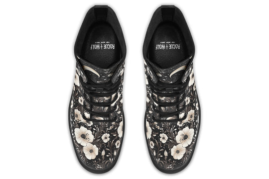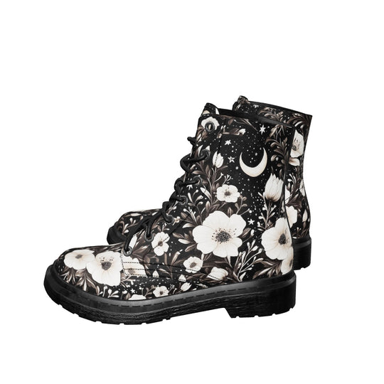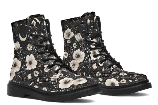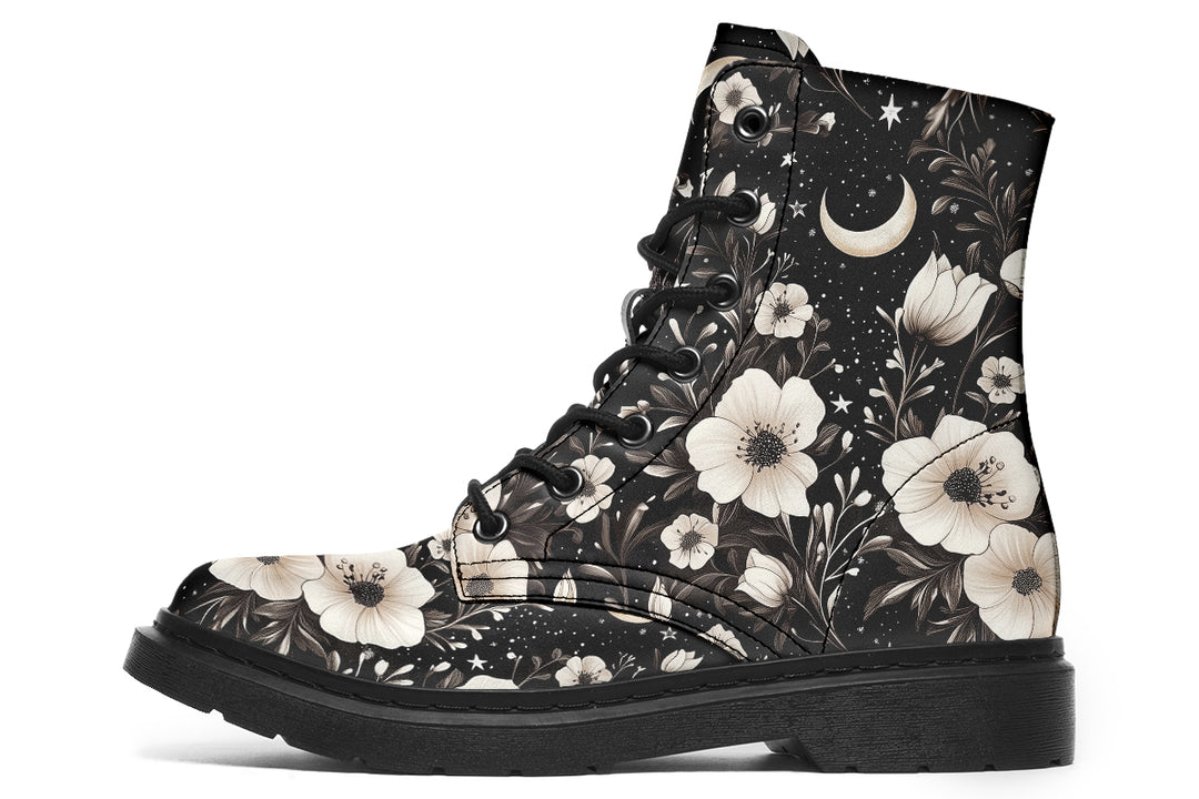 Serenity Boots: Where ghosts of midnight botanica bloom under a crescent moon—serenity, a little haunted.