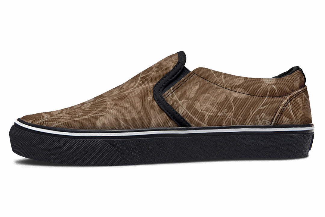 Soft ivory roses and winding Gothic vines flourish on a coffee-kissed background, conjuring quiet romance with every step. These slipons channel cottagecore mystique for the days when you want your witchcraft subtle but still deadly charming. Manifest that earthy elegance, sans spellwork.