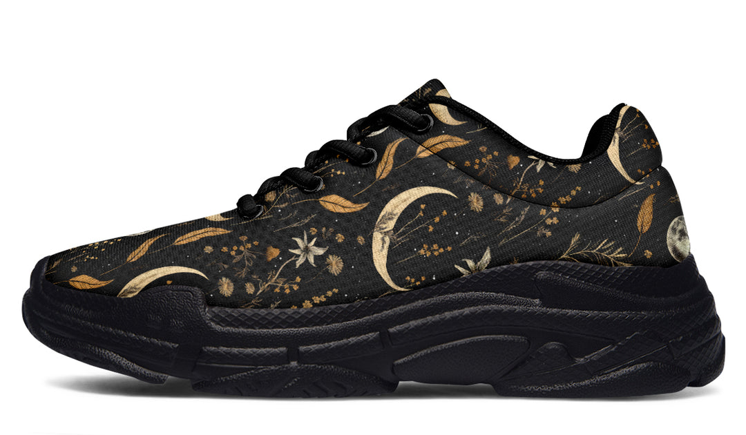 Embrace the mysteries of the night with these bewitching chunky sneakers, adorned with a mesmerizing pattern of moons and magical herbs against a starry black backdrop. These shoes are so spellbinding, you might just find yourself howling at the moon!