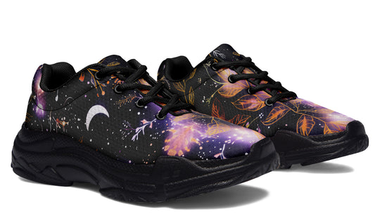 Dare to wander in a celestial garden, where starry skies meet blooming petals. These Cosmic Petals Chunky Sneakers take you on a mystical journey with their dark, dreamy backdrop lit with gold-outlined leaves and nebula-like patterns. Ready to embrace the enchanted world?