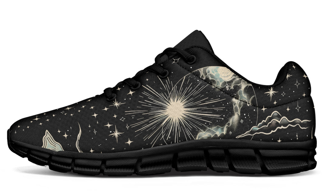 Step into the cosmos with our Dawn Star Athletic Sneakers, where each stride feels like a stroll through a fantastical night sky. Embrace the mystery of an eclipsing dawn star as you chase your dreams or the occasional mischief. These sports shoes blend dark street style with celestial vibes, perfect for the gothic adventurer in you.